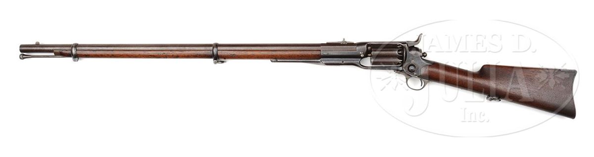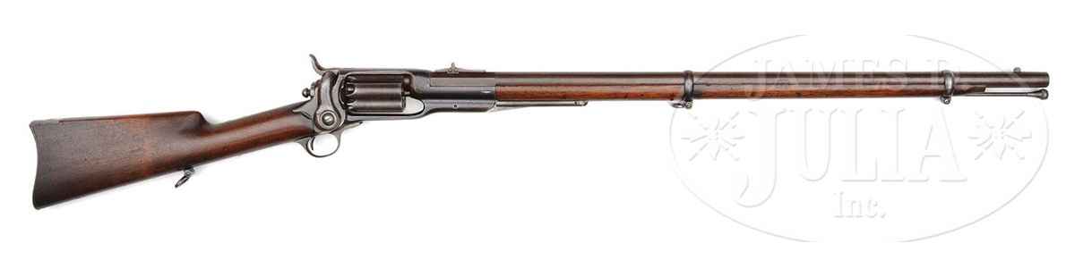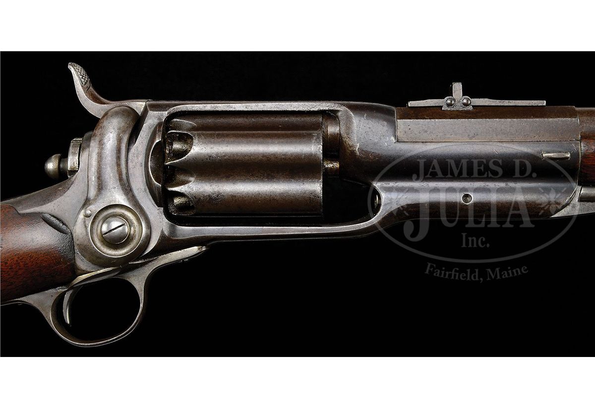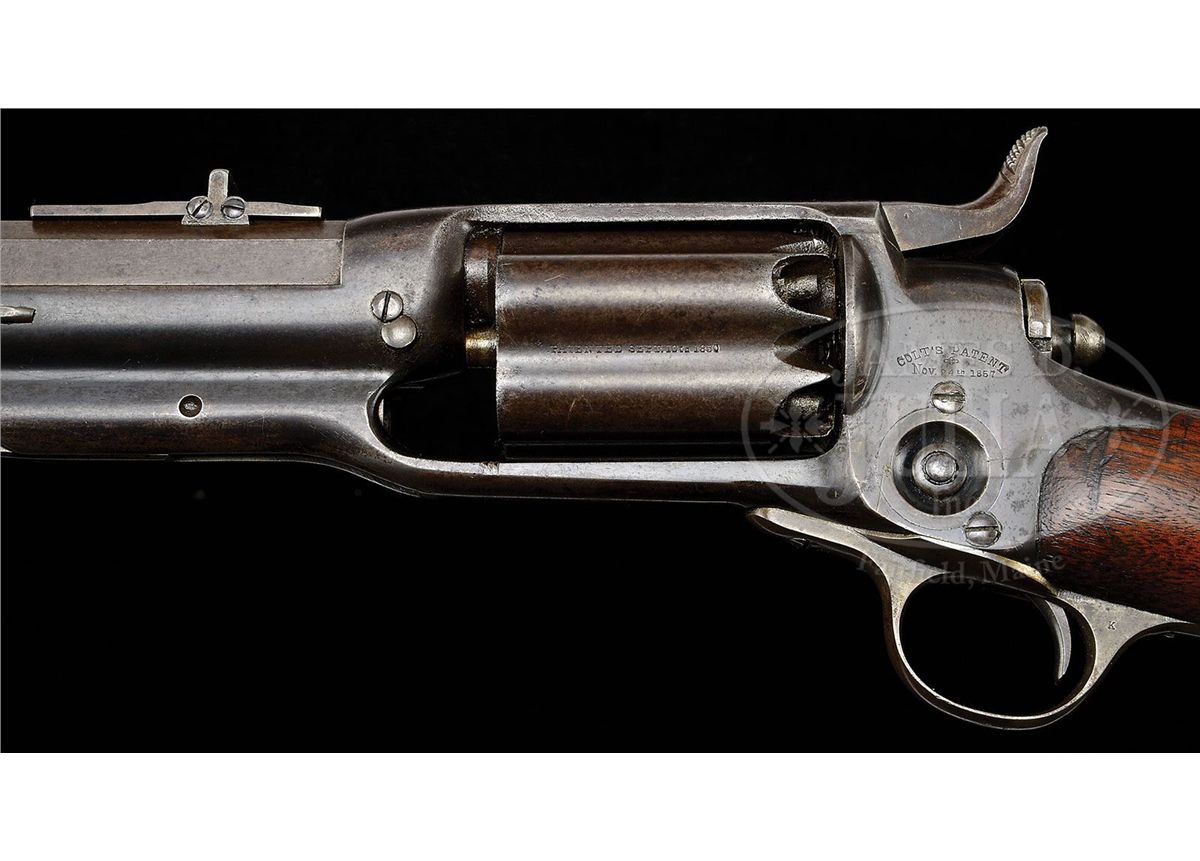 SN 2146. Cal. 56. 31-3/16" oct to rnd bbl three leaf flip up rear sight top flute of receiver is marked "COL. COLT HARTFORD CT. USA". 5 shot fluted cylinder, one of which is marked "PATENTED SEPT. 10TH, 1850". Left side of receiver behind recoil shield is marked "COLTS PATENT/NOVEMBER 24, 1857". Mounted with walnut stock, steel buttplate with trap door. Gun is iron mounted complete with sling swivels and small brass nosecap. Gun was not disassembled to check for matching serial numbers, however, external numbers visible all matched, and gun appears all orig. This was a popular Civil War era rifle purchased by U.S. Government, and by private contract such as this gun with no government inspector's marks. CONDITION: Fine overall. Bbl retains no orig blue but most of bbl is plum with small areas of pin-prick pitting and light nicks and scratches. Bbl bands show some orig blue turning plum with scattered nicks and scratches. Frame, cylinder, and hammer show tiny traces of orig blue overall being brown/gray with scattered dings and scratches. Mechanics are strong and functional. Bore exhibits very crisp distinct rifling. Buttstock and forestock are sound with a few minor nicks and dings. 4-48626 JS41