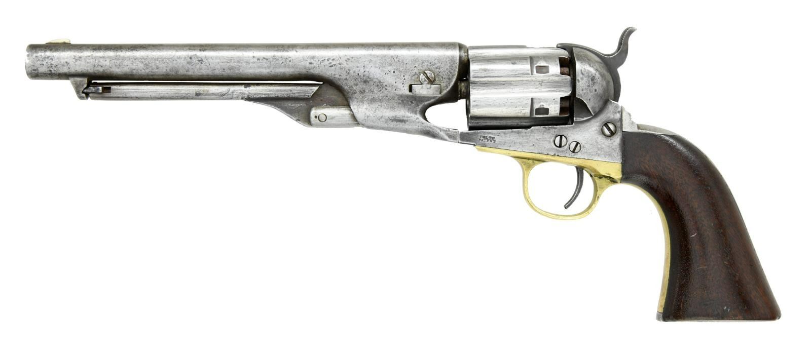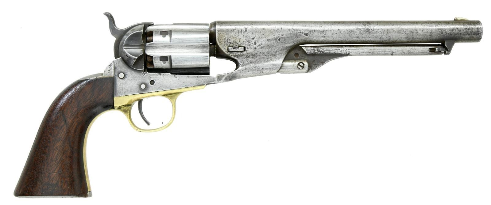 Cal. 44. S# 128385. Bbl. 8". Fixed blade front & simple notch on hammer rear sights. S#'s match throughout including wedge. Six shot cylinder is now fluted but appears to have been done after issue. Brass trigger guard & one piece walnut grips w/ faint outline of inspectors cartouche bottom right. CONDITION: metal surfaces have been aggressively cleaned to bare metal leaving Bbl. markings faint along w/ pitting, dents & scratches. Grips have a light added coat of finish over light dings & scratches. Bore retains strong rifling but is moderately pitted throughout. (01-23508/CW). ANTIQUE. $800-1,200.
