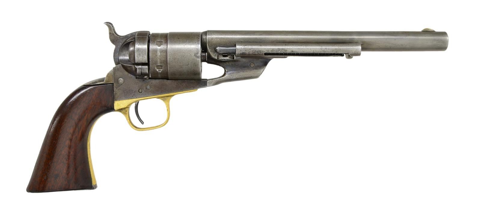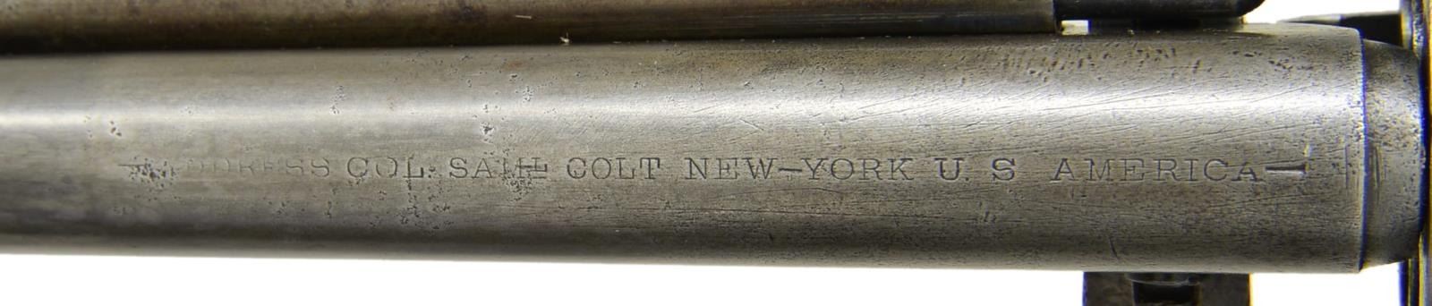 CONVERSION REVOLVER. Cal. 44 CF. S# 184324. Bbl. 8". Standard configuration w/ 8" bbl. marked w/ 1 line NY address. Left side of frame stamped w/ 2 line 1871-1872 patent dates. Colt factory conversion w/ hinged loading gate. Ejector housing assembly number 1403. CONDITION: very good overall. Appears original, complete & matching w/ traces of finish in protected areas. Markings discernable, bbl. address heavily worn. Grips refinished, retaining most of their applied varnish. Mechanically fine w/ bright shiny bore. PROVENANCE: The Estate Collection of Gary Parietti. (01-19253/JS). ANTIQUE. $1,200-1,800.