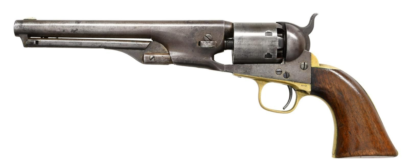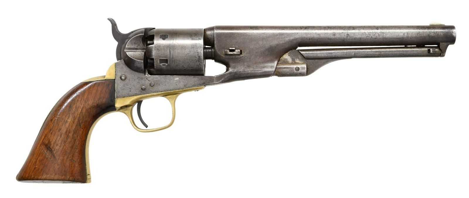 Cal. 36. S#. 8762. Bbl.7 1.2" round. Round 6 shot cyl. has naval engagement scene roll engraving. Creeping style loading lever. Original finish was blue & case colored with silver finished brass grip straps. 1 piece walnut grip. Bbl., frame, grip straps & cyl. have matching numbers. Wedge has non matching number 1915. 1862 mfg. CONDITION: Metal finish has faded to gray. Cyl. shows 30% lightly visible scene. Cleaned brass is reacquiring a mild patina. Refinished grips show wear with a deep dent on right panel and a series of small dents at butt. Sound action. Bore retains intact rifling showing areas of pitting. PROVENANCE: Marshall "Brook" Davis Collection. (01-23538/DS). ANTIQUE. $2000-2750.