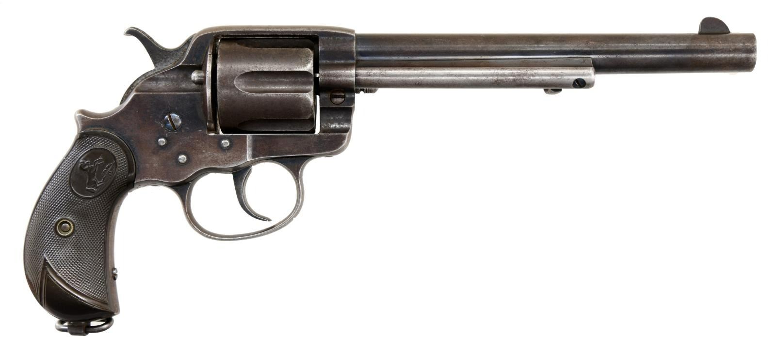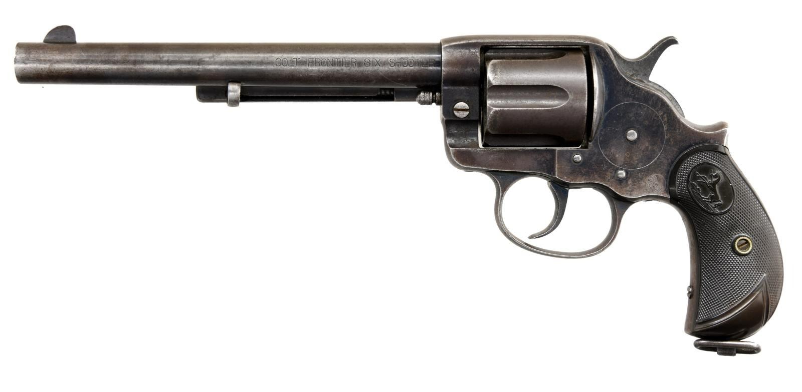 Cal. 44-40. S# 36401. Mfg. late 1896 w/ matching S# (401) on cylinder. Bbl. 7 1/2". Fixed blade front & simple notch rear sights. "COLT FRONTIER SIX SHOOTER" roll marked on Bbl. Blued finish, checkered rampant Colt hard rubber grips & 6 shot fluted cylinder. Lanyard loop in butt. CONDITION. metal retains about 20% fading & thinning original blue finish w/ the balance a brown/gray patina w/ freckling, light rust, scratches & scattered pinprick to light pitting. Grips are moderately worn w/ fair texture to the checkering & a chip missing lower right panel. Bore is good, very bright w/ strong rifling & scattered pits throughout. (01-23515/CW). ANTIQUE. $1,200-1,800.
