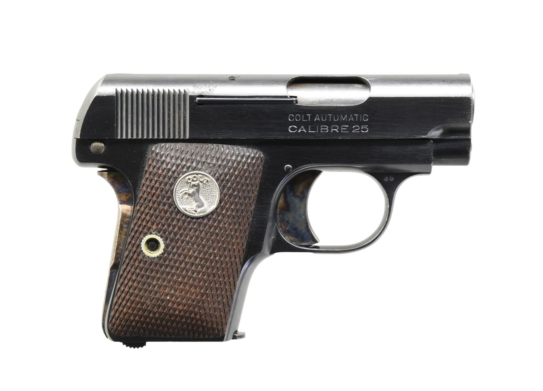 Cal. 25 ACP. S# 366713. Bbl. 2 1/8". Model 1908 Vest Pocket semi-automatic pistol mfg. by Colt in 1927. Left side of the slide is marked with Colt's mfg. and patent information, followed by the Rampant Colt logo, with the cal. designation marked on the right. Metal components exhibit a blue finish overall, save for on the trigger, slide safety lever, and grip safety, which exhibit a case color hardened finish. Bbl. is polished in-the-white. Frame is mounted with 2-piece Colt silver medallion checkered wood grips. Slide is matching to the frame via the full S# on the interior. MAGS: one 6-rd. CONDITION: metal components retain the vast majority of their original factory blue finish, exhibiting some light edge wear, some superficial handling marks, as well as a few scattered spots of light surface oxidation overall. Trigger, slide safety lever, and grip safety retain strong and vibrant case color hardening. Very bright bore, exhibiting some very light pitting while retaining well-defined rifling throughout. Grips show some light smoothing as well as some scattered marks from handling and storage, but otherwise remain sturdy and serviceable. An attractive example of a Colt Model 1908 Vest Pocket pistol. (24-5579/MLW). CURIO. $400-600.
