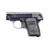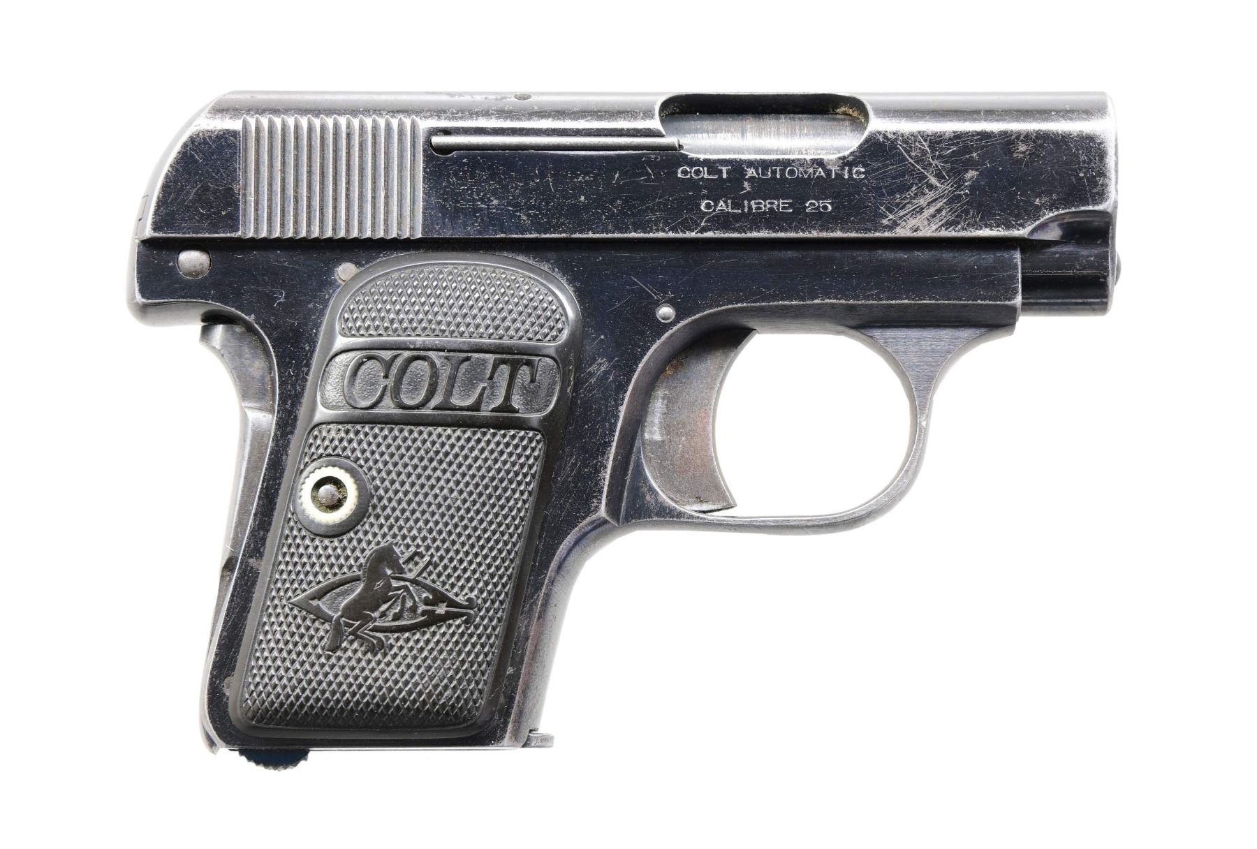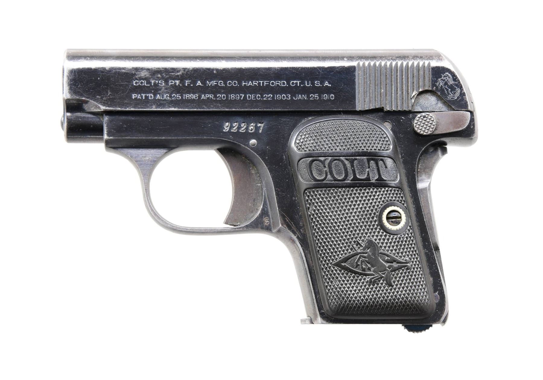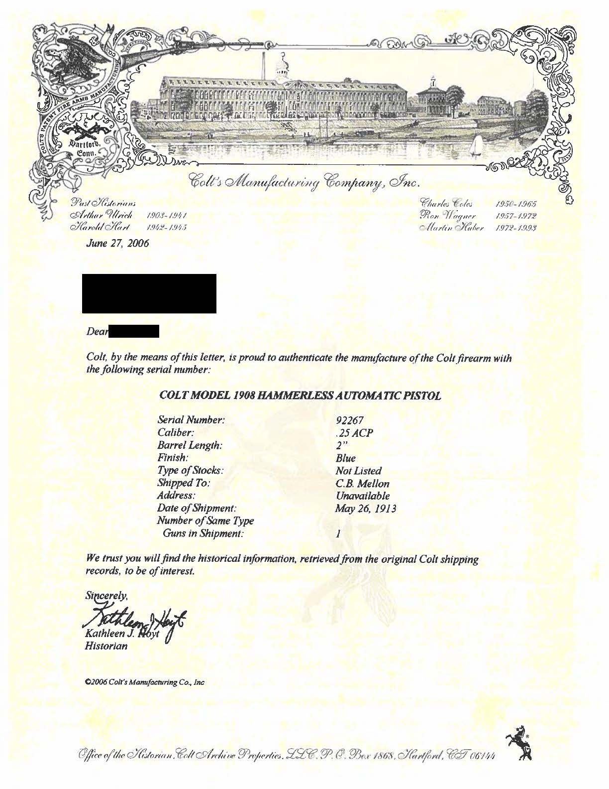 WITH FACTORY LETTER. Cal. 25 ACP. S# 92267. Bbl. 2 1/8". Model 1908 Vest Pocket semi-automatic pistol mfg. by Colt in 1913. Left side of the slide is marked with Colt's mfg. and patent information, followed by the Rampant Colt logo, with "COLT AUTOMATIC/ CALIBRE 25" marked on the right. Metal components exhibit a blue finish overall. Frame is mounted with 2-piece Colt checkered black hard rubber grips that feature the Rampant Colt in front of a stylized "C." MAGS: one 6-rd. UNATTACHED ACCESSORIES: factory letter indicating that this example was the sole pistol shipped to "C.B. Mellon" (address unavailable) on May 26th of 1913. CONDITION: metal components retain the majority of their original factory blue finish, exhibiting edge wear, scattered superficial handling marks, as well as flecks of light surface oxidation overall. Grip safety exhibits wear and thinning through to a gray patina. Bore is bright, exhibiting scattered small spots of dark pitting while retaining strong rifling throughout. Action functions appropriately when cycled by hand. Grips exhibit some scattered marks from handling and storage, as well as some smoothing, but otherwise remain sturdy and serviceable. (24-3805/MLW). CURIO. $300-500.