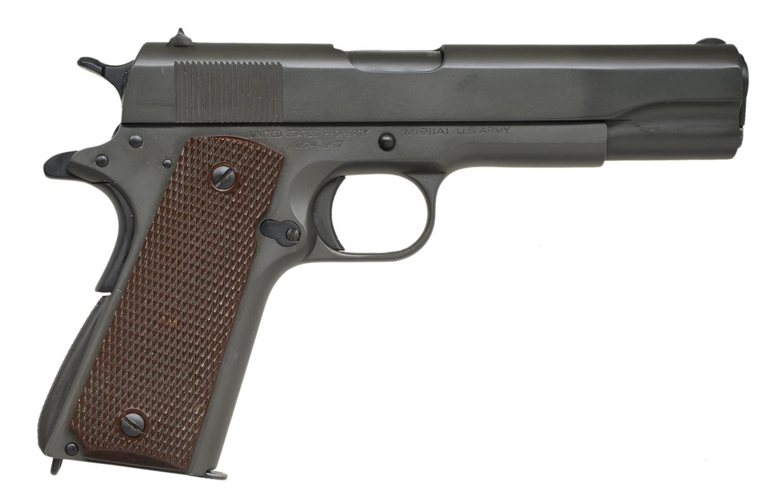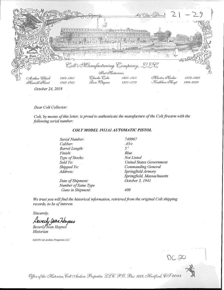 Cal. 45 ACP. S# 740967. Bbl. 5". Shipped Oct. 3, 1941 to Springfield Armory; 400 units. Boxed RS inspection; also appearing by disconnector on frame along w/ G. All correct metal features w/ matching S# on slide under firing pin stop plus "P" on left bbl. leg & "G" in front of legs. Checkered Coltwood grips w/ mold #; correct would be Coltrock w/ plain backs. MAGS: 1 very good blued Ridson 7 rd. UNATTACHED ACCESSORIES: 2018 dated factory letter. CONDITION: light bbl. wear at port; all other surfaces near excellent as reparkerized. Near excellent grips. Fair dark bore; worn & pitted. (21-29/NW). CURIO. $1,000-1,700.