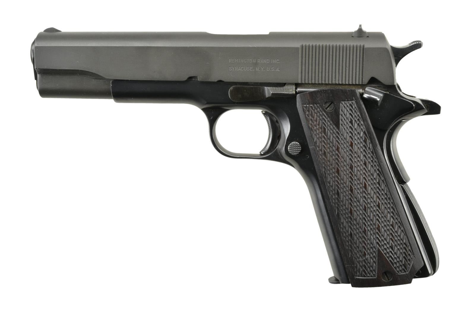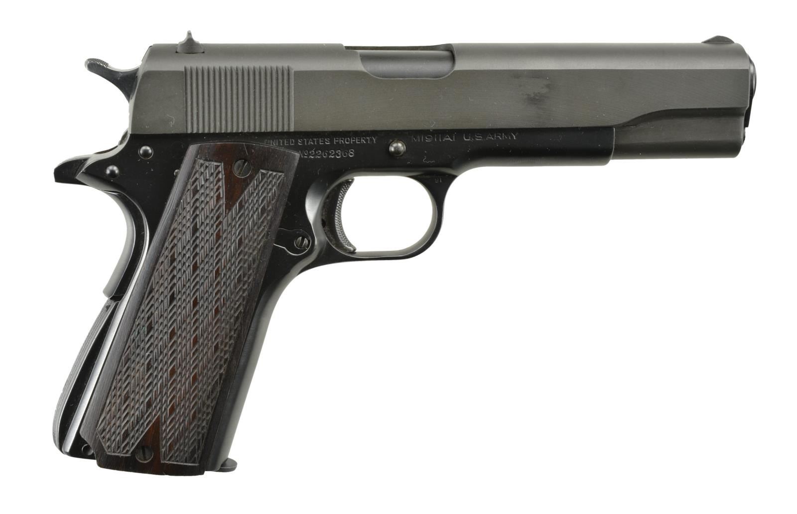 Cal. 45 ACP. S# 2262368. Bbl. 5" Colt Type 6 w/ marking on top reading rear to front; boxed C on left leg. Mfg. 1945 w/ frame having all correct features including 7 rib arched mainspring housing. Checkered thumb safety & undercut slide lock. Ordnance mark & faint "GHD". Left side of trigger guard w/ "VP" proof plus "F"; "91" on right. Parkerized Remington Rand slide w/ blued extractor & firing pin retainer. Thick skip line checkered dark hardwood grips retained by added drilled & tapped screws at extreme top & bottom of grips. MAGS: 1 very good 7 rd. marked "COLT .45 AUTO". CONDITION: very good overall appearance w/ commercial quality reblued frame. Hammer polished to chrome like appearance. Lanyard loop cut flush w/ housing before bluing. 5 extra drilled & tapped holes on each side of frame under grips providing for various grip attachments; installation of bushings would regain normal functioning. Near excellent slide & bbl. including bore. Very good trigger pull & near excellent grips. (22-2401/NW). CURIO. $500-800.