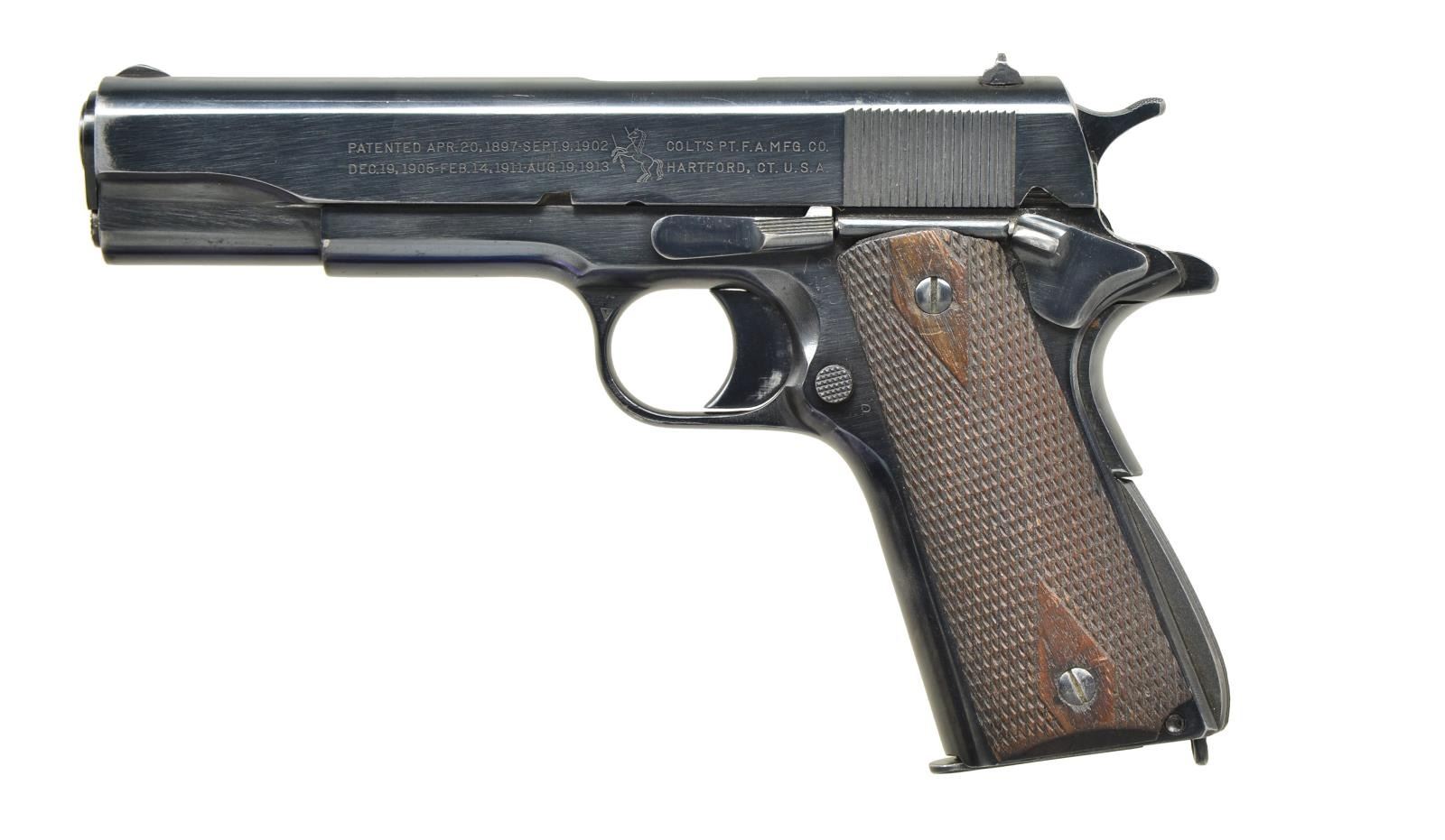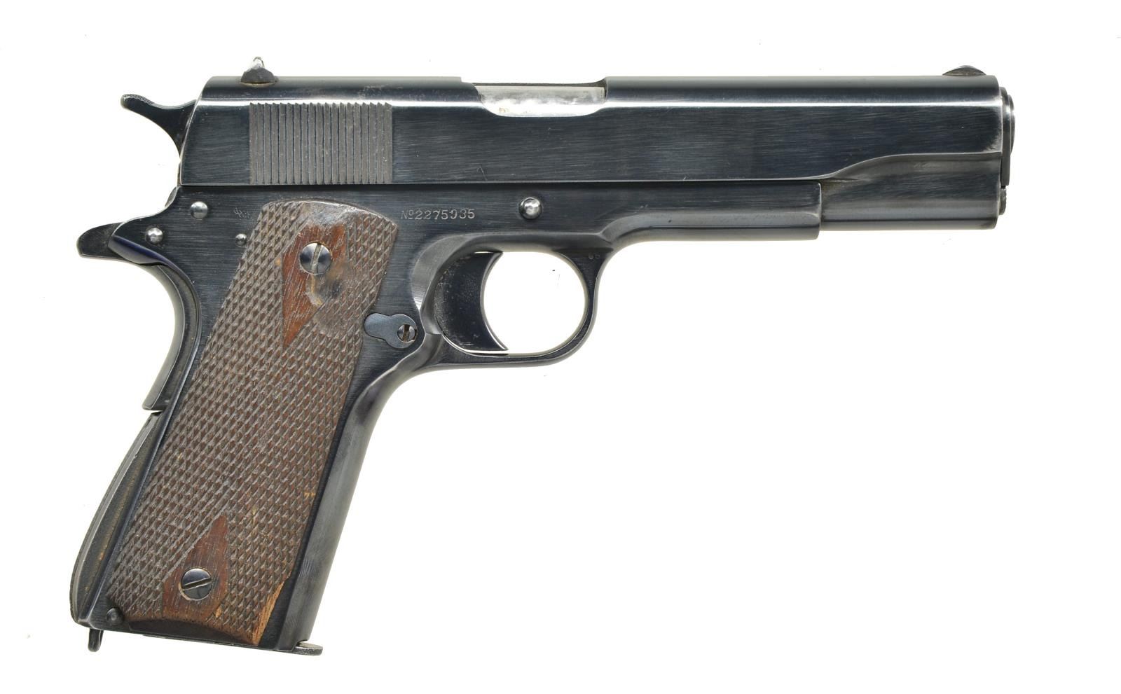 Cal. 45 ACP. S# 2275935. Bbl. 5". Pistol has been completely refinished with the serial number intact but no mfg. marks on the frame. There are however “GHD” inspectors marks left side frame. Fixed blade front and notch rear sights. Narrow spur hammer, serrated arched mainspring housing with lanyard loop. Flannery barrel marked “F” on right side lug. Grips are original service Colt double diamond. MAGS: 1-7 rd. “COLT 45 AUTO”. CONDITION: metal surfaces are reblued and retain about 90% coverage; the barrel hood has been polished. Grips have flattened points but still retain solid texture. Right panel has a chip missing lower right corner and dents on the upper diamond. Bore is good plus, bright and strongly rifled with frosting in the grooves. (22-4606/CW). CURIO. $900-1,200.
