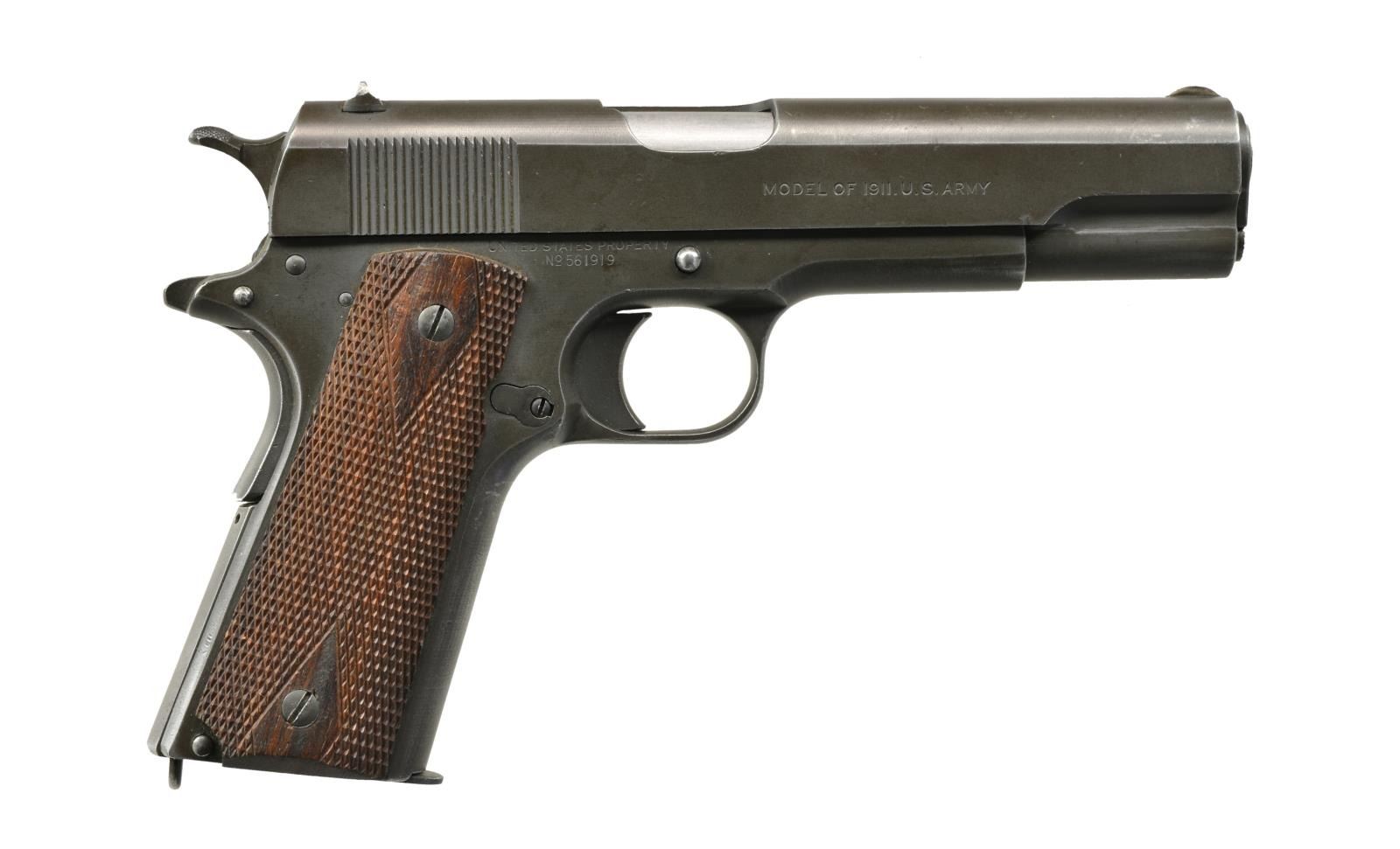Cal. 45 ACP. S# 561919. Bbl. 5". Mfg. 1918 as 1 of 347,000 for Army contract. Border checkered long spur hammer as used until midyear. Safety tab checkered w/ milling cut instead of w/out. Slide lock correct w/ checkering & milling cut. Later production Colt type 6 bbl. as used after S# 710000 (1937). Frame & rear of slide w/ proper "H" provisional acceptance mark plus Springfield “S8”. Left side of trigger guard at rear assembler numbered 16 plus U.S. property mark on right side of frame by S#. Correct appearing dbl. diamond aftermarket grips. MAGS: 3 very good post WWII contract 7 rd. marked on base w/ “ASSY” & “MFR.” numbers. CONDITION: very good example w/ light high edge wear along w/ noticeable marks on front of slide from frame dust cover. Noticeable function wear on left side of hammer. Slight thinning of finish in grip area. Near excellent grips. Fair bore w/ wear & even light pitting. (20-1466/NW). CURIO. $1,000-1,500.