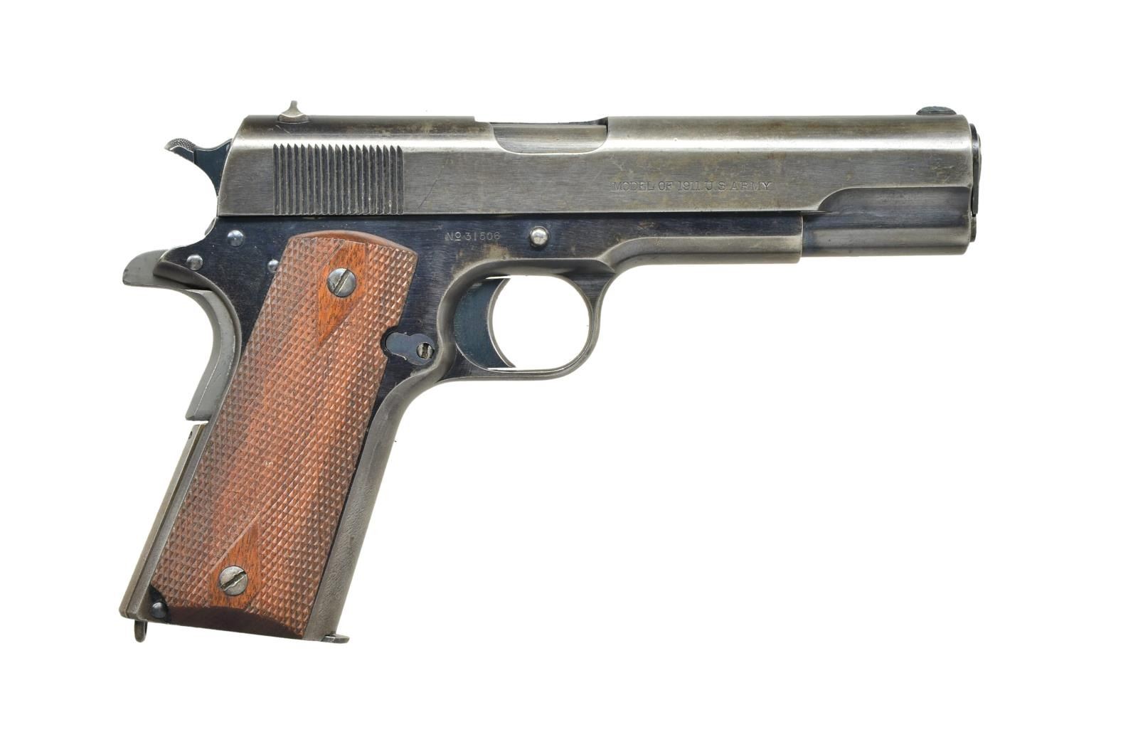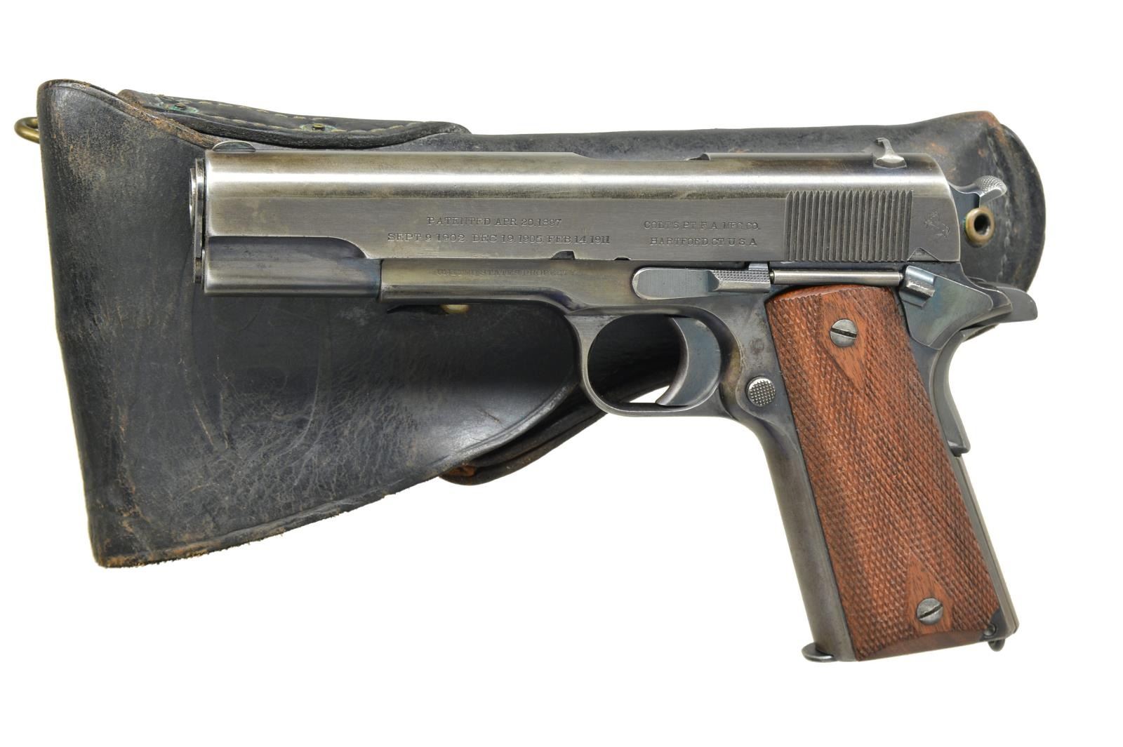 Cal. 45 ACP. S# 31506. Bbl. 5" early Type 1 as used from S# 100 to 6500 having horizontal serif "H" on rear of hood. Mfg. 1913 in Army contract of 19,150 units. Early unnumbered slide with 1911 patent date, rampant Colt behind left cocking grooves, round top U notched rear sight, tapered blade front sight, Army marking on right side and "H" provisional mark at rear; "H" also by disconnector along with "V". Mostly correct features (unless noted) to include slide stop plus thin safety tab; both checkered and undercut. Long tang grip safety and mag. latch are parkerized replacements as are finely checkered, aftermarket double diamond grips. Flat mainspring housing with lanyard loop. Early hammer with short beavertail and bordered checkering. Long, smooth faced trigger. Appearance of early spring guide with sharp points ground off; not later blunt profile. Finish is Colt's furnace blued "Fine Finish". MAGS: 1 very good unmarked, two toned 7 rd. UNATTACHED ACCESSORIES: good brown Boyt US flap holster having front and edges user dyed black. "BOYT -45-" marked back. CONDITION: good to very good overall appearance with fading / thinning on various areas such as slide and grip area. Extremely light mark from typical improper slide stop installation. Feed ramp in frame has been polished and barrel is lightly throated with fair worn bore having even pitting giving dark tone. Near excellent grips; thinning finish on screws with light slot marks. Slot mark on mag. release screw. (22-4425/NW). CURIO. $1,500-2,000.