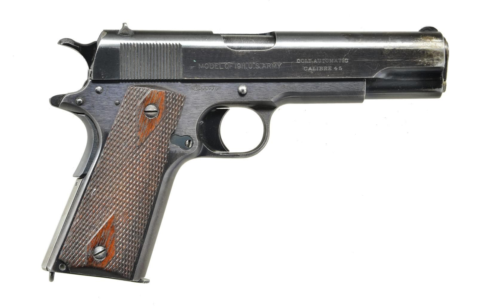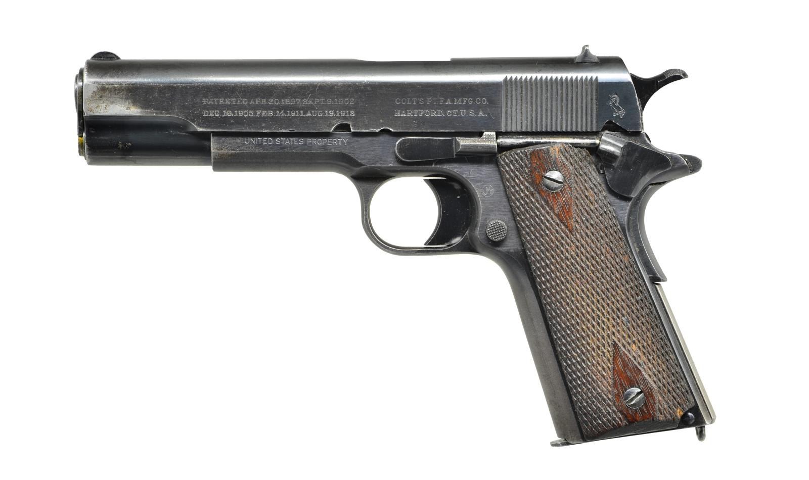 Cal. 45 ACP. S# C 300775. Bbl. 5" correct Type 4 with "P" and "H" on top. Mfg.1918 w/ double diamond walnut grips having 15 rows between diamonds. Unnumbered slide w/ rampant Colt at left rear, semi circular front sight & U notched rear. Long spur beavertail hammer with border checkering & rounded spur plus long smooth faced trigger. Provisional "H" acceptance mark by disconnector along with "V" and "G"; "JMG" inspector mark by mag. release. Slide stop & safety tab both checkered and undercut. MAGS: 1 good to very good unmarked two toned 7 rd. CONDITION: very good overall appearance with holster like high point wear at front of slide. Faded finish on mainspring housing having light gray appearance. All blued bbl. with light function wear at top rear. Light high point wear and occasional spots of pinprick to peppery oxidation & light scratches. Thinning finish on front strap with beginning patina appearance. Small scratches below slide stop. Mag. latch screw exhibits improper screwdriver use. Good to very good grips with occasional marks and very slight flattening of diamonds; slight extra wear at butt. Very good bore with faint hint of frosting. (22-4236/NW). CURIO. $1,500-2,200.