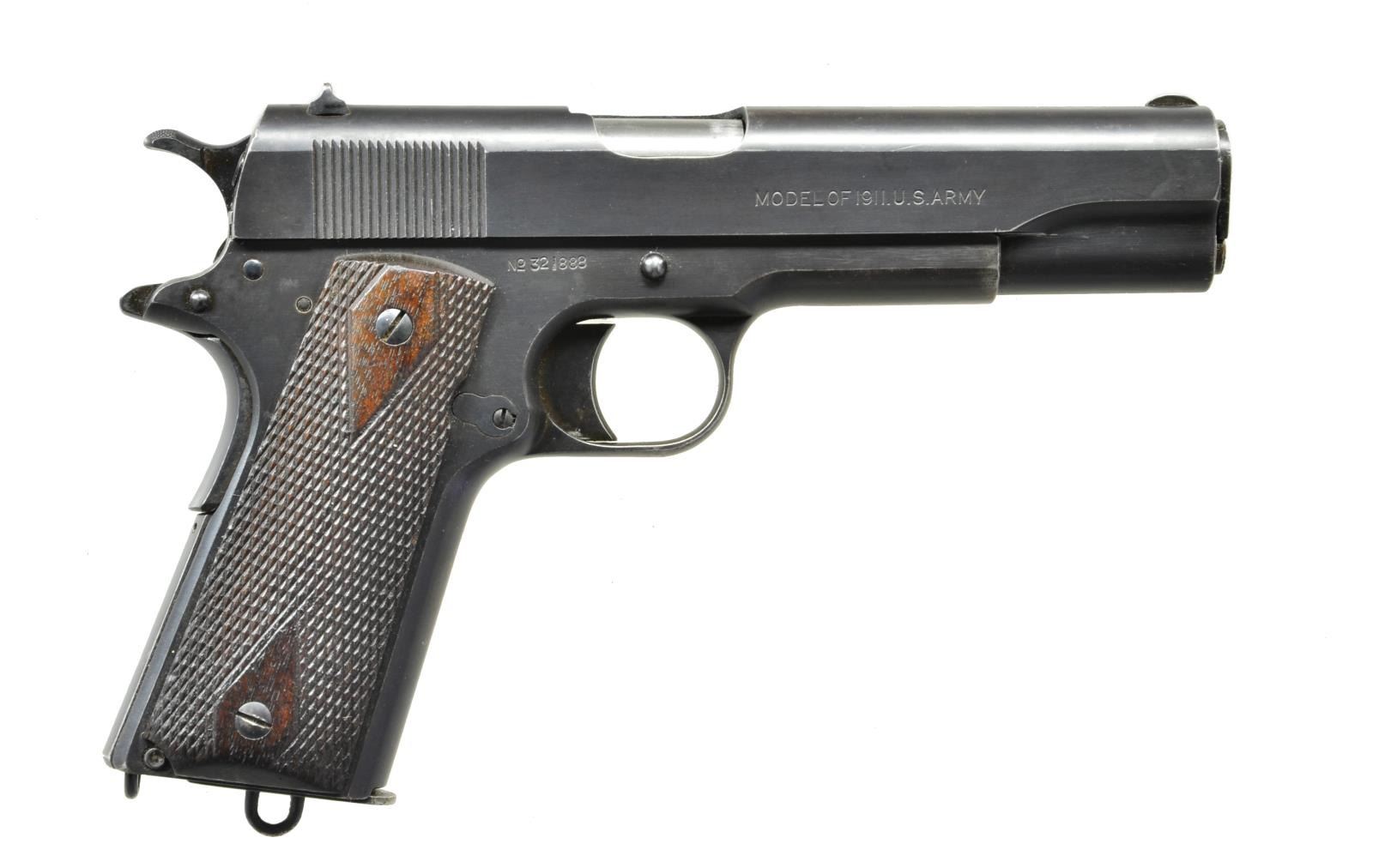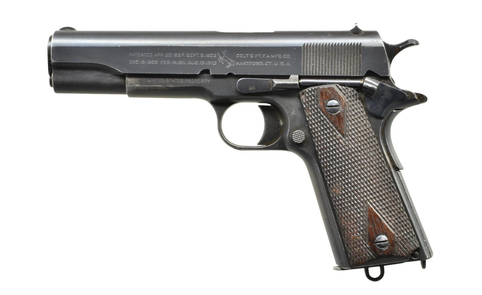 Cal. 45 ACP. S# 321888. Bbl. 5" Colt Type 6 w/ "S" in front of legs as used on later production models after S# 710,000. Mfg. May - October 24 of 1918 under Army contract; 347,000 units (largest Army pistol contract of both World Wars). Rear of slide & frame by disconnector have correct "H" provisional acceptance marks; also "G" & "O" by disconnector. Eagle acceptance mark of "S14". Checkered slide stop & thumb safety both w/ milled undercuts. MAGS: 1 good 7 rd. 2 tone w/ lanyard loop. CONDITION: very good overall appearance w/ slight high point wear & scattered sm. areas of pinprick oxidation. Very clear markings. Flattened diamond tops from hand wear w/ extra wear at bottom front of right grip. Near excellent bore. (22-4302/NW). CURIO. $1,800-2,500..