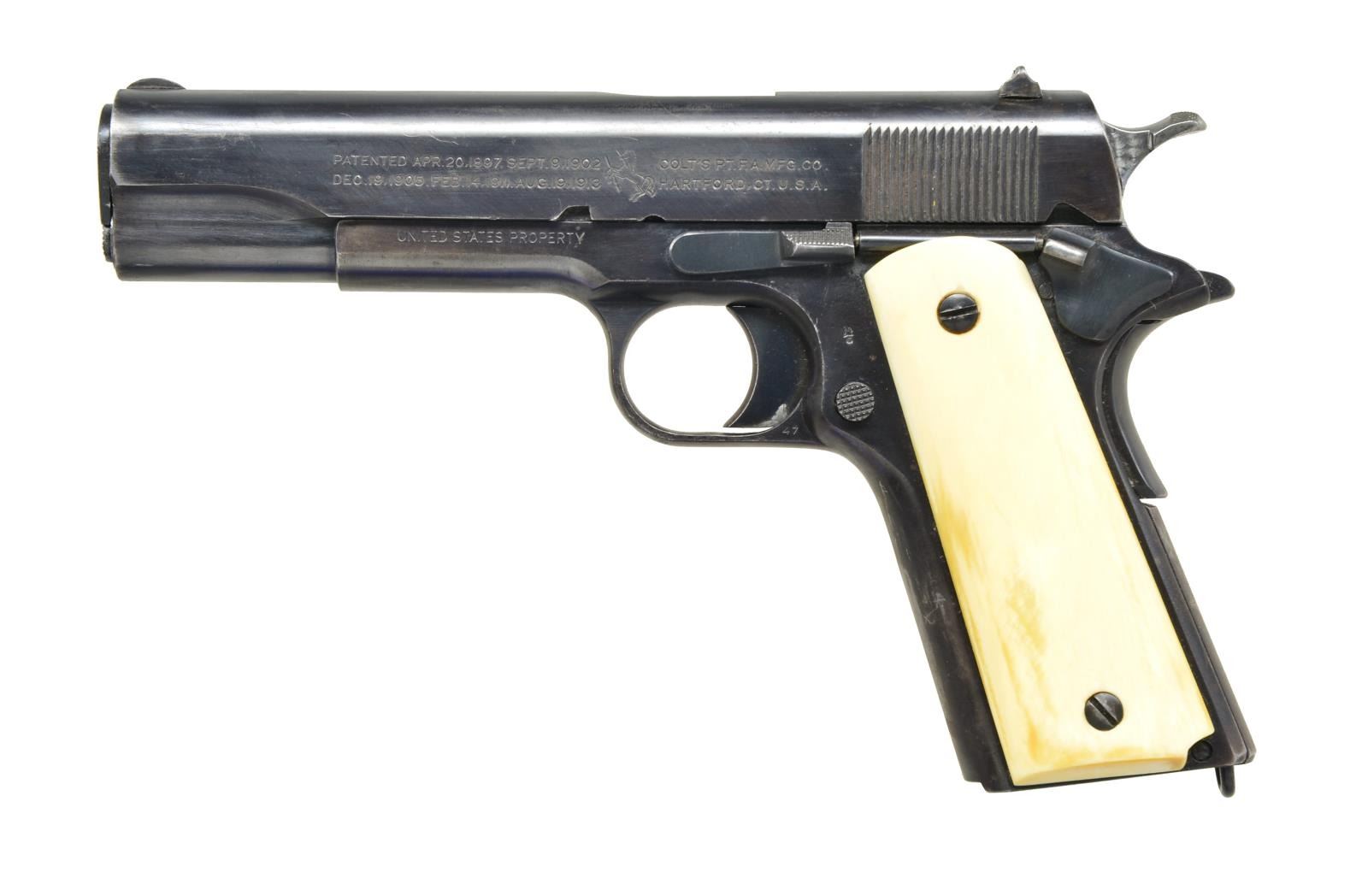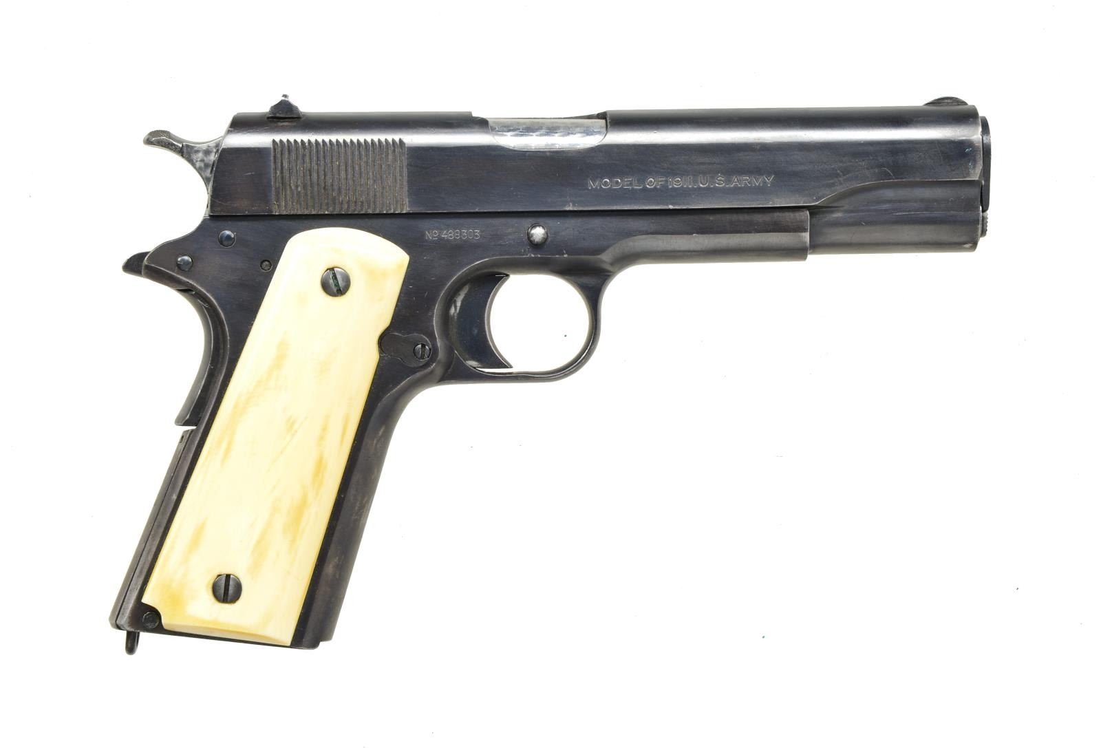 Cal. 45 ACP. S# 488303. Bbl. 5" that appears to be correct Colt Type 4 but no visible marks on top; "5" on bottom in front of legs plus top port area is jeweled. Mfg. 1918 in single largest Army contract of both wars; 347,000 units. Slide has rampant Colt at midpoint of left side. U notch rear sight, semi circular front sight & "H" provisional mark at rear of appropriately unnumbered slide. Type C beavertail hammer w/ bordered checkering & jeweled sides. Slide stop (w/ undercut) & safety tab (w/out undercut) both checkered; correct for model. Long trigger w/ smooth face. "H" provisional mark by disconnector. Eagle "6" frame proof. Spring plug w/ round detent. Spring guide w/ blunt legs, beveled front & shock buffer. Flat mainspring housing w/ lanyard loop. Smooth stag grips w/ streaked traces of bark; each pencil numbered 10 on back. "47" at left rear of trigger guard. MAGS: NONE. CONDITION: very good refinished appearance w/ contours & markings well preserved. Slight high point & function wear including very faint mark from improper slide stop installation. Noticeable wear on front strap & mainspring housing yet grip safety is very good. Good plus bore w/ light frosting in grooves. (22-4861/NW). CURIO. $1,200-1,800.