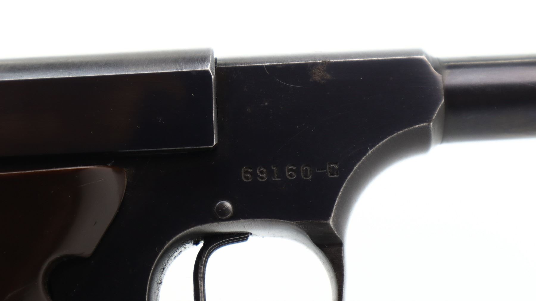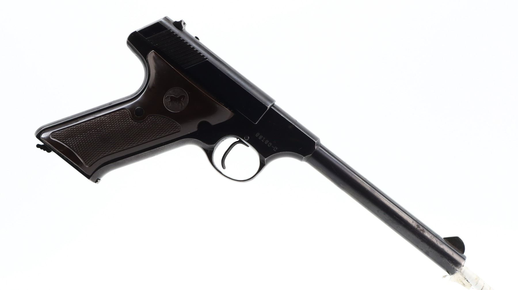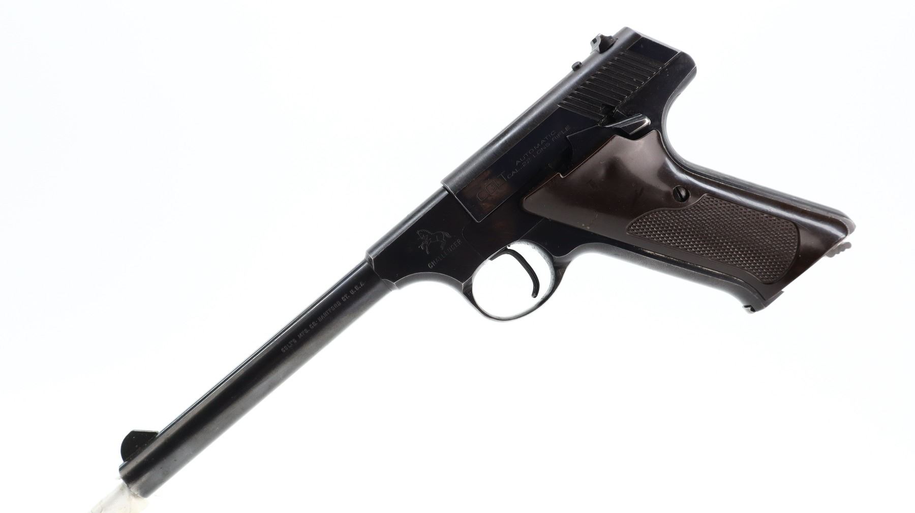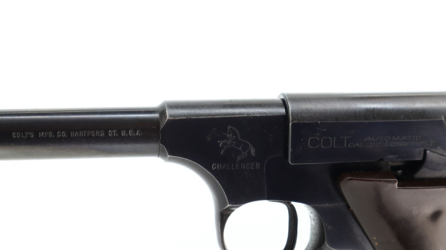 6/10 , COLT , MODEL: CHALLENGER , CALIBER: 22 LR. COMES WITH MAGAZINE. BORE IS FAIR WITH LIGHT PITTING. DATE OF MANUFACTURE 1953. BLADE FRONT SIGHT, ADJUSTABLE REAR SIGHT. CHECKERED BROWN PLASTIC GRIPS WITH COLT LOGO. METAL FINISH SHOWS SOME SCRATCHES, HANDLING MARKS AND WEAR. GRIPS SHOW SOME LIGHT SCRATCHES.. ACTION: SEMI AUTOMATIC. BARREL LENGTH: 152MM. SERIAL # 69160-C. CONDITION: 6/10. CLASS: CANADIAN RESTRICTED CLASS