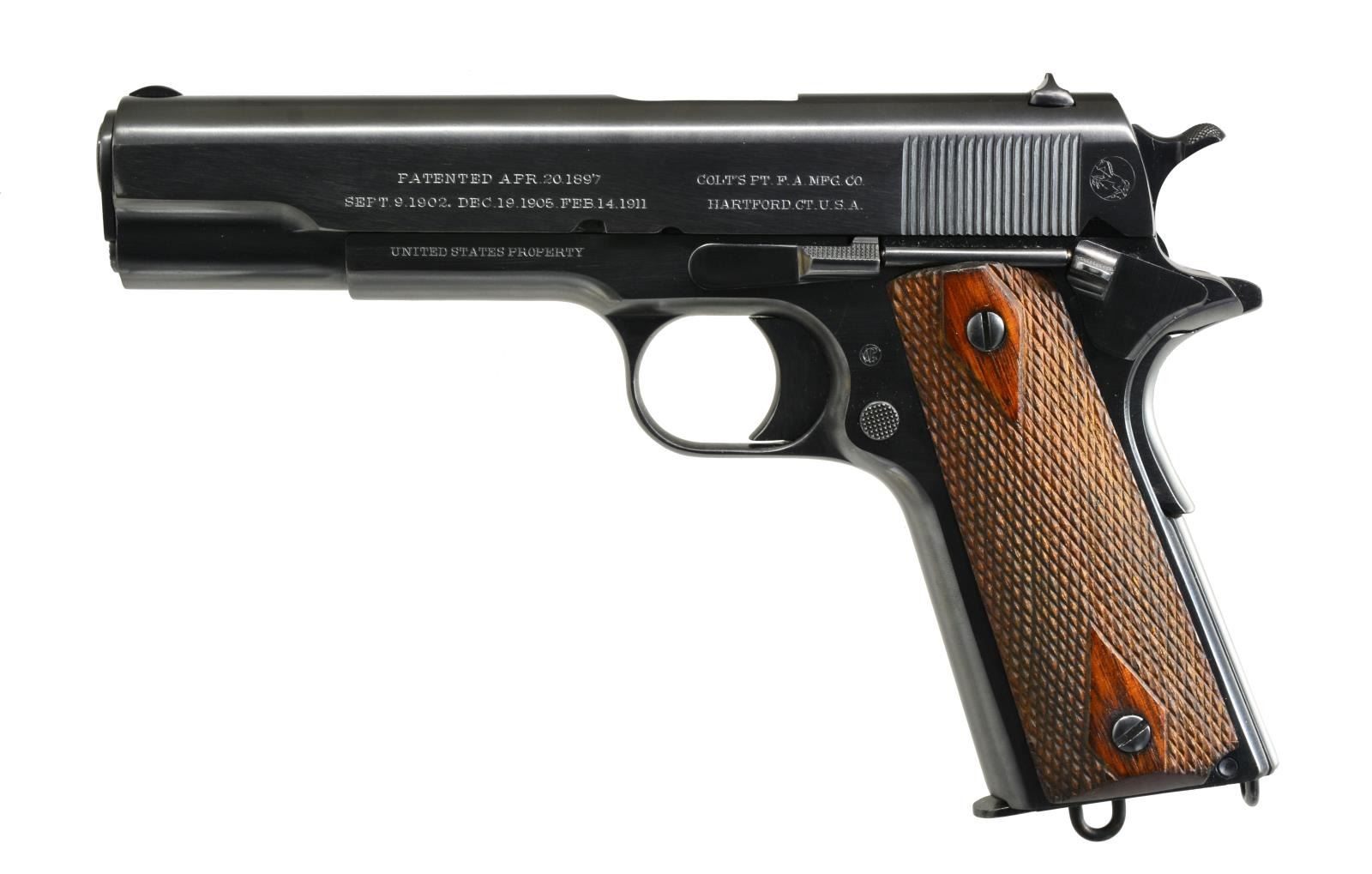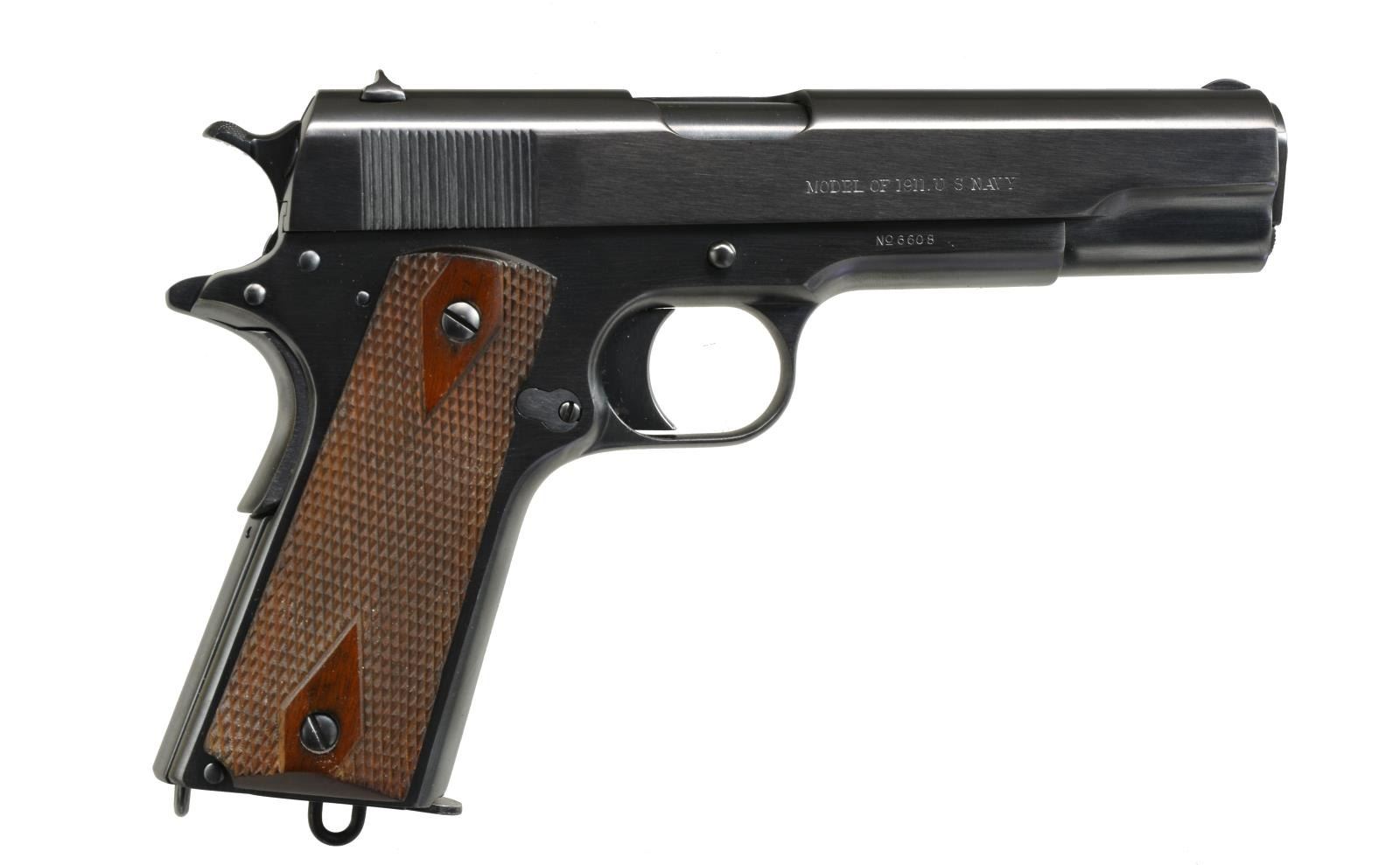 Cal. 45 ACP. S# 6608. Bbl. 5" Colt type 2 w/ correct vertically aligned "H" on face of hood. Mfg. 1912 as 1 of 1000 USN order. All correct features except recoil spring guide of later style w/ blunt legs. MAGS: 1 near excellent 1911 style 7 rd. all blued w/ lanyard loop; 1912s were 2 toned. CONDITION: near excellent appearance including correct double diamond walnut grips. Consignor states Turnbull restoration. Very faint scratch from improper slide stop installation. Fully blued firing pin. Very faint rub marks at front of slide. Very slight edge wear around extractor hole at rear of slide. Very nice looking example of scarce model. No signs of firing since restoration. Near excellent bore. (20-2297/NW). CURIO. $3,000-5,000.