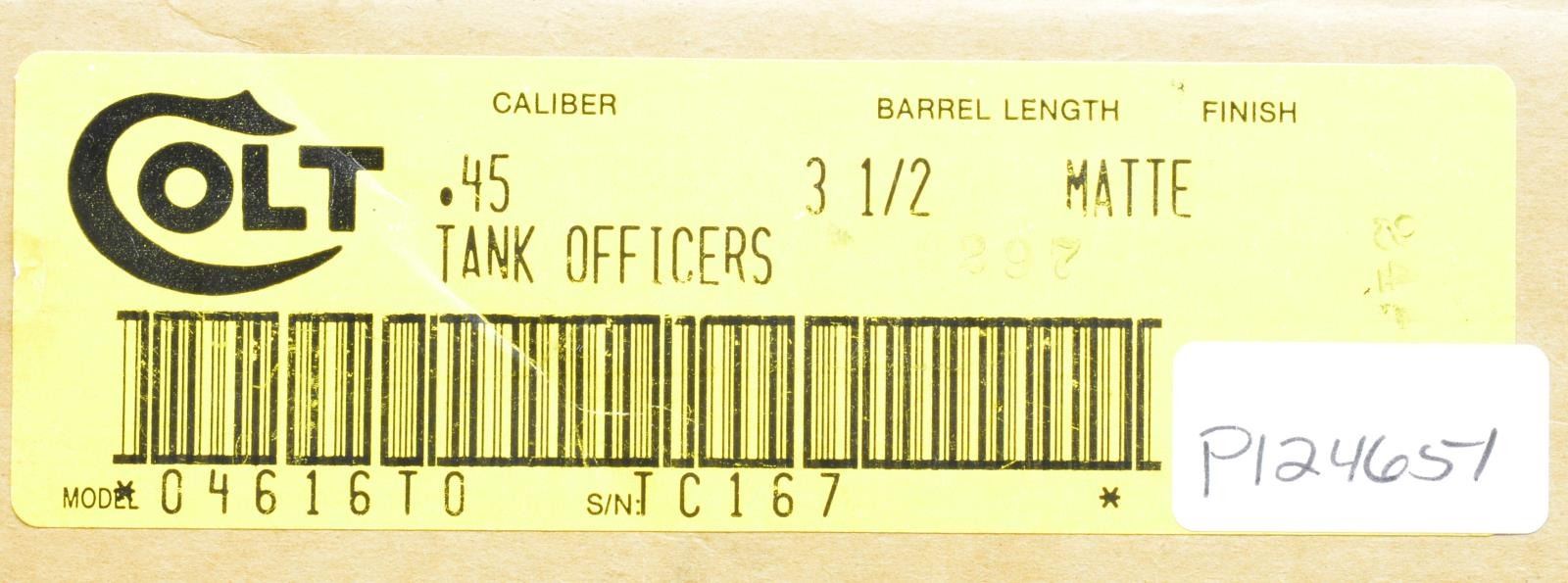 Cal. 45 ACP. S# TC167. Bbl. 3 1/2". Special limited run from Colt Custom Shop of Officer's ACP mfg. 1989 & additionally marked "TANK OFFICERS"; 350 produced. Most standard Officer's ACP features having fixed 3 dot sights, serrated front strap & smooth flat mainspring housing w/ lanyard loop. Matte finished except for blued bbl. bushing & trigger. Standard length grip frame of Commander size having Commander style hammer w/ in the white sides. Basically Officer's ACP slide on Commander frame. Blued bbl., in the white at port. Smooth exotic wood grips w/ gold Colt medallions. MAGS: 2 Colt TOTAL; 7 rd. in pistol plus new in package 6 rd. for true Officer's Model. UNATTACHED ACCESSORIES: original Colt supplied Nylon zippered pouch w/ packaging plus shipping sleeve w/ Colt Tank Officers label. CONDITION: extremely light function wear showing on bbl. at port, sides of grip safety & sm. spot on right side of trigger. Slide has sm. mark above "RS" of Officers on left side, 2 sm. marks near front sight plus 2 approx. 1/2" x 1/2" squares of missing finish in front of cocking grooves on each side. Sm. spot of high point wear on right side of trigger guard. Balance of finish very good to excellent. Near excellent bore & grips. (20-1639/NW). MODERN. $1,500-2,500.