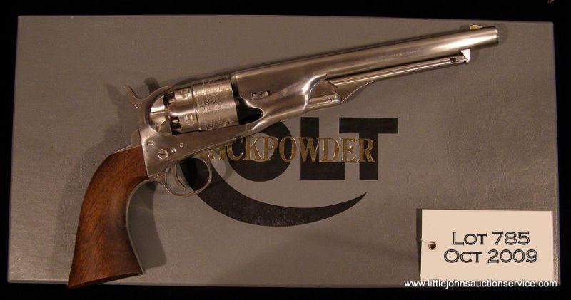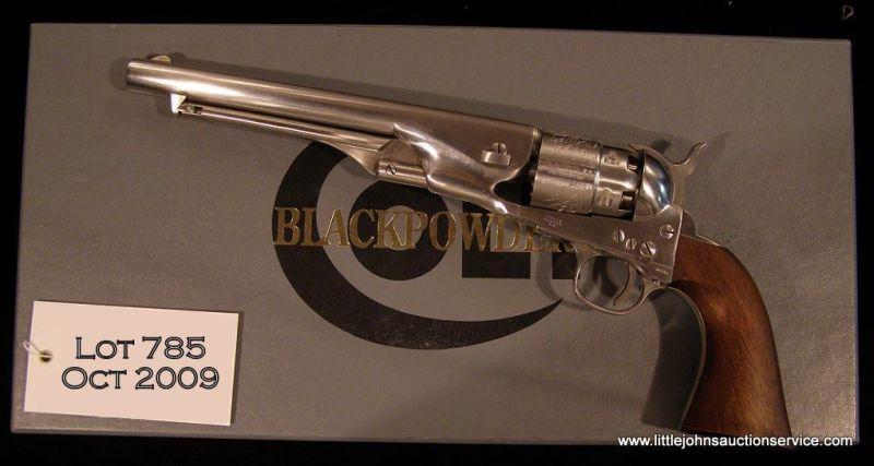 COLT Model 1860 Army New Black Powder Series, # 212765S, .44 cal. percussion, revolver in desirable stainless steel, cut for butt stock with 4 screw frame, standard wood grips. Excellent to mint in original box. No evidence of use. Est.$600-$1200.