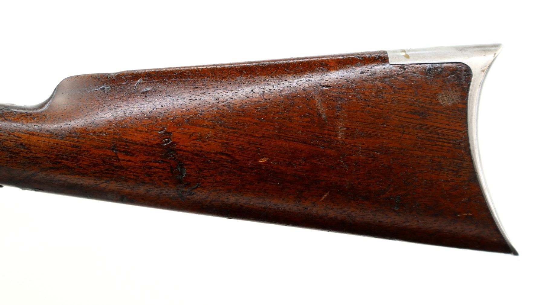 Main Description: Manufactured 1889. USA Antique. Blade front sight, adjustable u notched rear sight, traces of bluing remaining, round barrel, left side of receiver has visible Colt Rampant Horse logo visible. Checkered spur hammer, action functions. Three piece wood stocks, checkered forearm, straight grip, smooth curved steel butt plate, full length magtube.