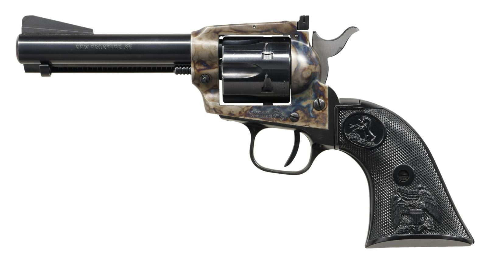 CYLINDER. Cal. .22 LR. S# G120598. Bbl 4 3/8". New Frontier manufactured by Colt in 1975. Left side of barrel is stamped "NEW FRONTIER .22", with Colt's single line address across the top. Left side of frame bears patent information followed by the Rampant Colt logo. Case color hardened frame with blued cylinder and barrel, as well as a black anodized aluminum grip frame. Serrated ramp front sight with adjustable square notch rear sight. Frame is mounted with 2-piece Colt checkered black plastic grips. UNATTACHED ACCESSORIES: matching factory cardboard box containing its original styrofoam insert, a spare cylinder, and original factory paperwork. CONDITION: Very good overall, with metal components retaining the vast majority of their original factory applied finishes, exhibiting some light spots of wear on the cylinder. Mirror bore, exhibiting well defined rifling throughout. Grips are near excellent. Box exhibits exterior wear and a few taped repairs, with one end flap having torn off, but remaining present within the box. (23-1780/MLW). MODERN. $500-750.