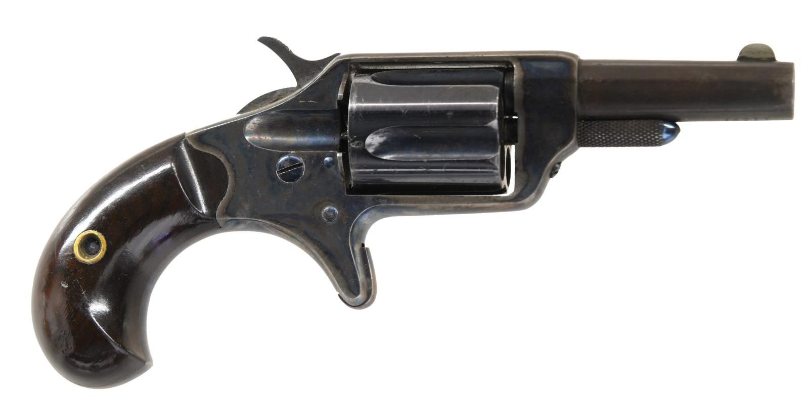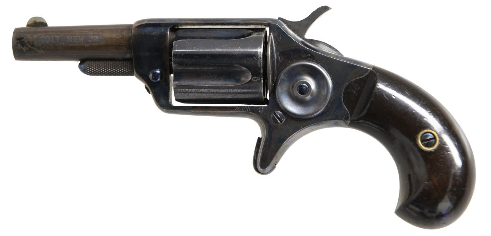 Cal. 32 CF. S# 11891. Bbl. 2 1/4" w/ German silver semi-circular front sight. Five shot long flute cyl. Spur trigger. Etched panel cal. marking. Blue & case colored finish. 2 piece rosewood bird's head grips. Total of approx. 22,000 mfg. 1873-84. CONDITION: very fine. Frame retains over 90% case colors. Cyl. retains over 80% blue showing spots of freckling. Bbl. blue is fading to brown. Original grip finish shows scattered scratches & marks. Tight action. Bore retains sharp rifling showing small spots of very light pitting. (01-21876/DS). ANTIQUE. $500-1,000.