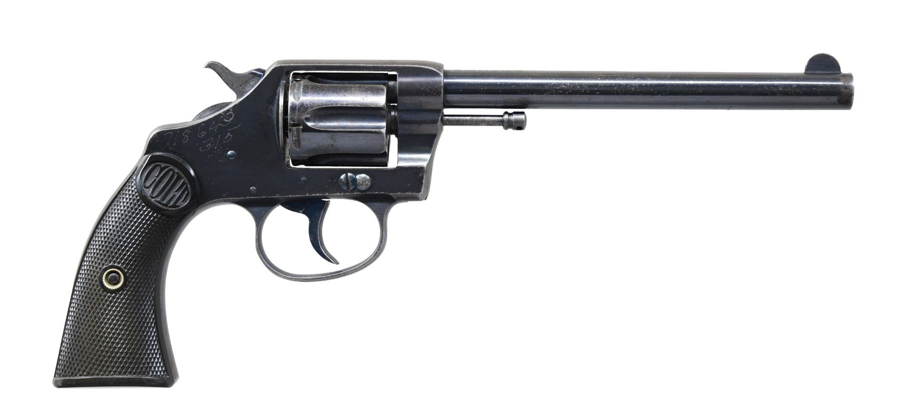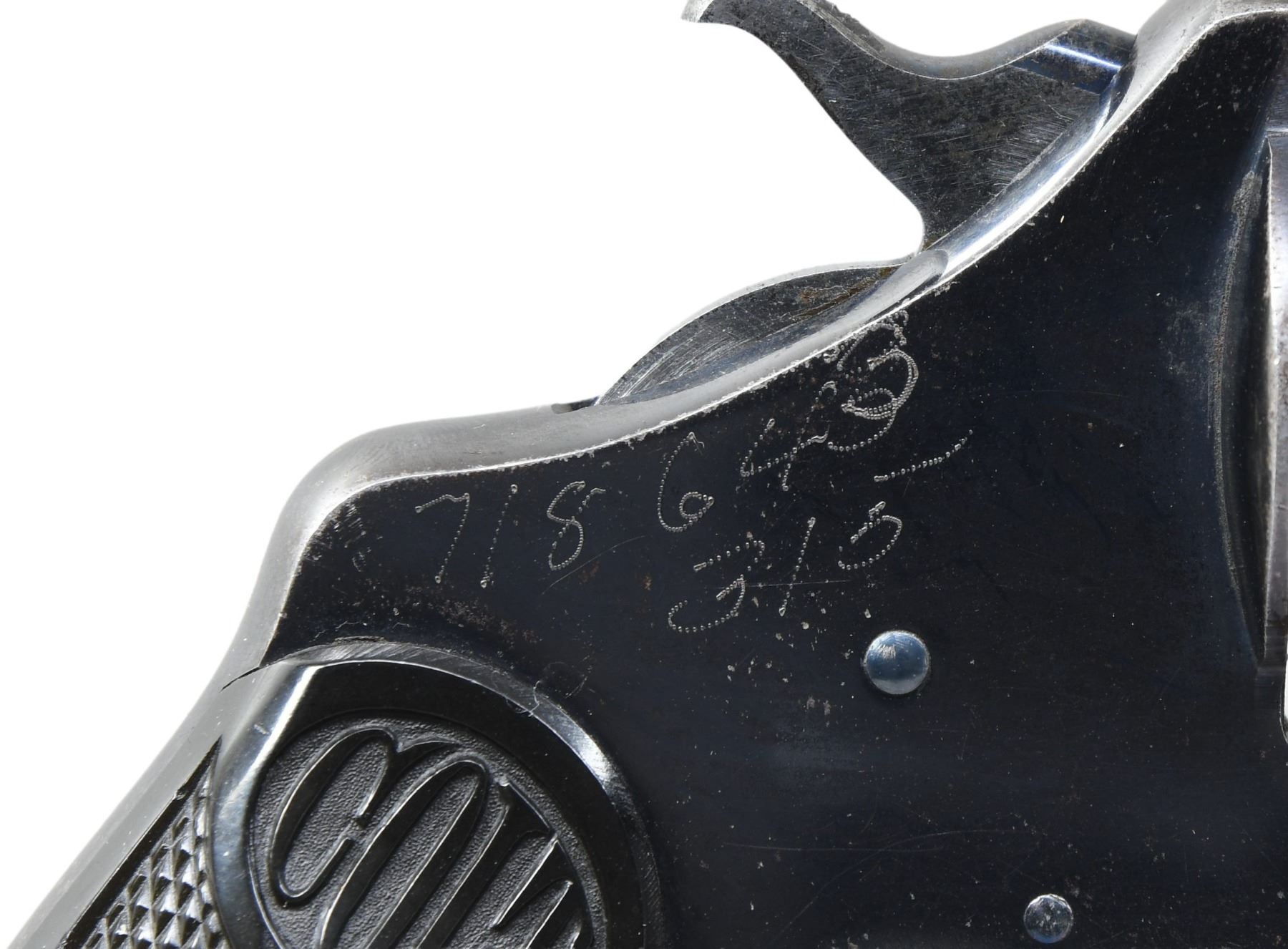 Cal. 32 Long Colt. S# 10000. Bbl. 6". New Police double action revolver mfg. by Colt in 1901. Left side of the bbl. is marked "COLT D.A. 32", with Colt's 3-line address marked across the top towards the breech. 3-line of address appears to be poorly stamped and is mostly illegible. Left side of frame is marked "COLT'S/ NEW POLICE" with Maltese crosses surrounding the Rampant Colt logo. Right side of frame is electro-penciled "718 643/ 315". Metal components exhibit a high polished blue finish overall. Trigger, frame screws, grip screw, and rear strap of hammer are nitre blued. Frame is mounted with 2-piece "COLT" checkered brown hard rubber grips. Half-moon blade front sight with frame notched rear sight. Full serial # "10000" is present on the frame and cyl. crane, and is also inscribed on the interior of the grip panels. CONDITION: metal components retain large amounts of their original factory blue finish, showing wear, thinning, and scattered spots of light to mild surface oxidation overall. Very bright bore with well defined rifling throughout. Action functions appropriately when cycled by hand. Grips show some light smoothing and a few superficial handling marks overall. (25-5189/MLW). CURIO. $250-400.