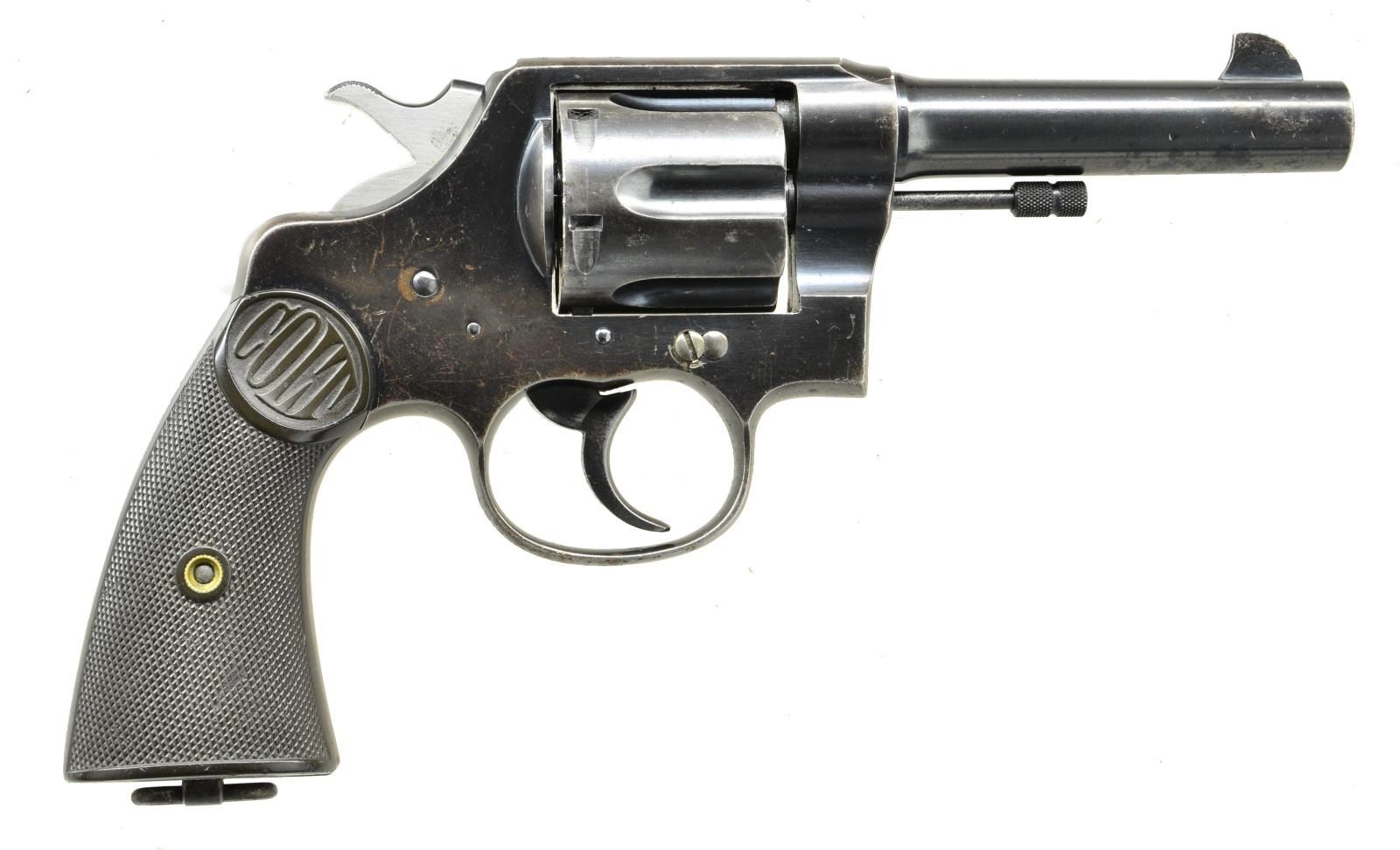 Cal. 455 Eley. S# 145030. Bbl. 4 1/2" with blade sight. 6 Shot cylinder. Blue finish with polished hammer sides. Butt has lanyard loop. 2 Piece checkered hard rubber Colt marked grips. Mfg. 1917. CONDITION: over 70% lightly worn blue showing edge and carry wear with scattered scratches and marks showing fading on cylinder. Grips show light wear. Bore is bright with sound rifling showing small spots of light pitting. (22-4265/DS). CURIO. $1,000-1,500.
