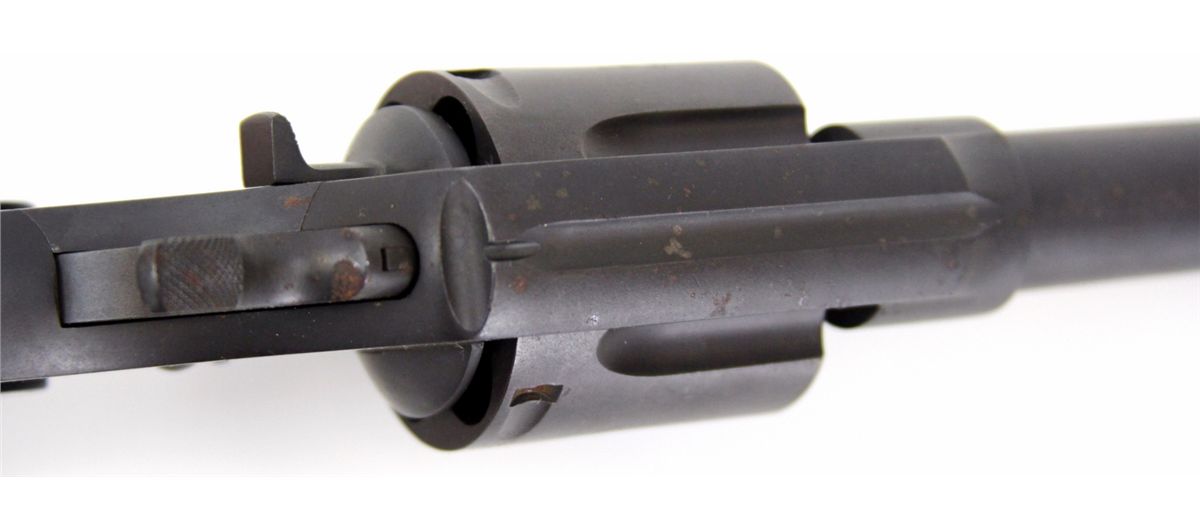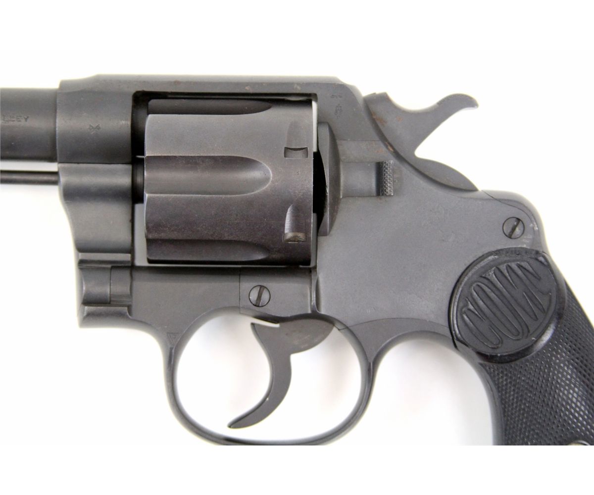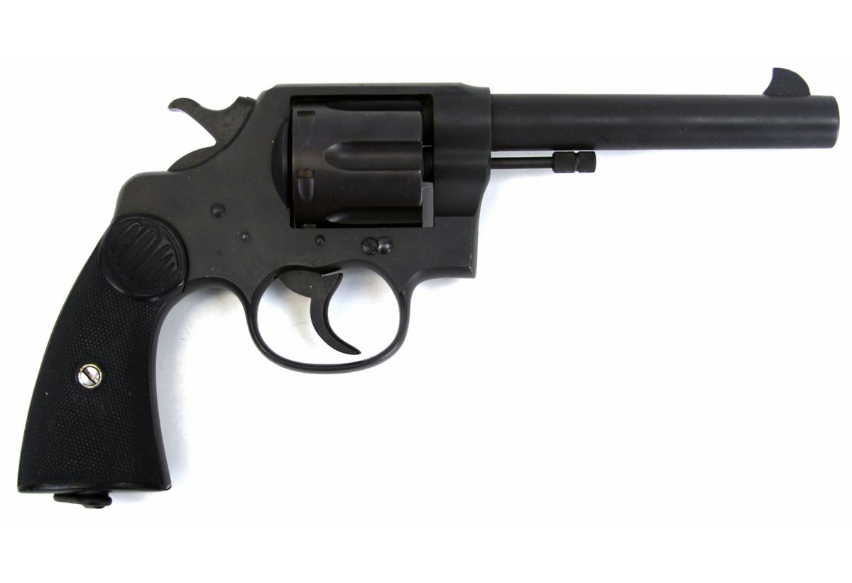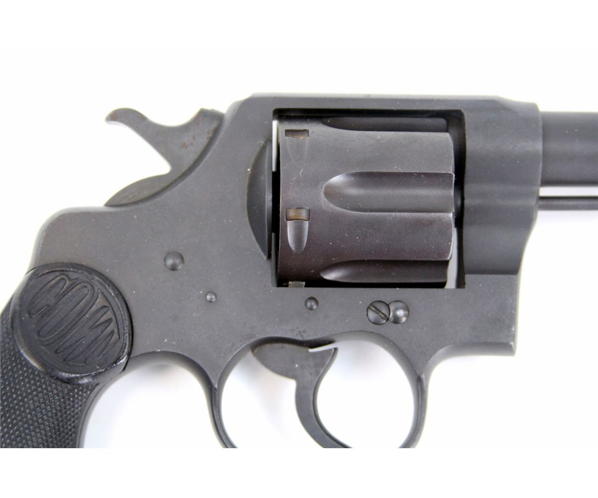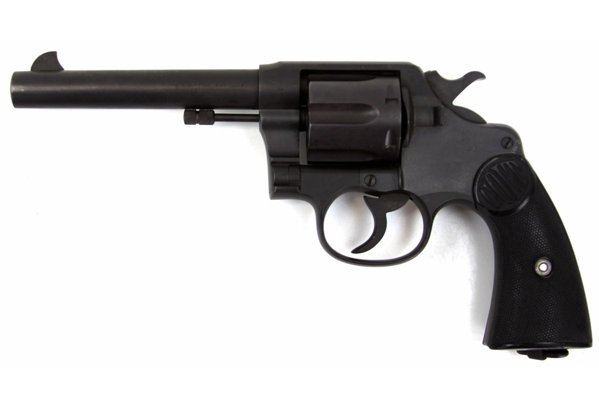 COLT NEW SERVICE REVOLVER IN .455 ELEY Colt New Service revolver in .455 Eley. 5.5 inch barrel, with 6 shot fluted cylinder, and black Colt plastic grips. Colt two line patent and address on top of barrel. Crossed swords proof mark on left of frame and cylinder face. Black phosphate finish. manufactured in 1918. Type: Revolver Manufacturer: Colt Model: New Service Caliber / Gauge: .455 Eley Barrel Length: 5.5 inch Serial Number: 148257 Condition: Bore is excellent. Finish appears to possibly be re-finish. Grips excellent