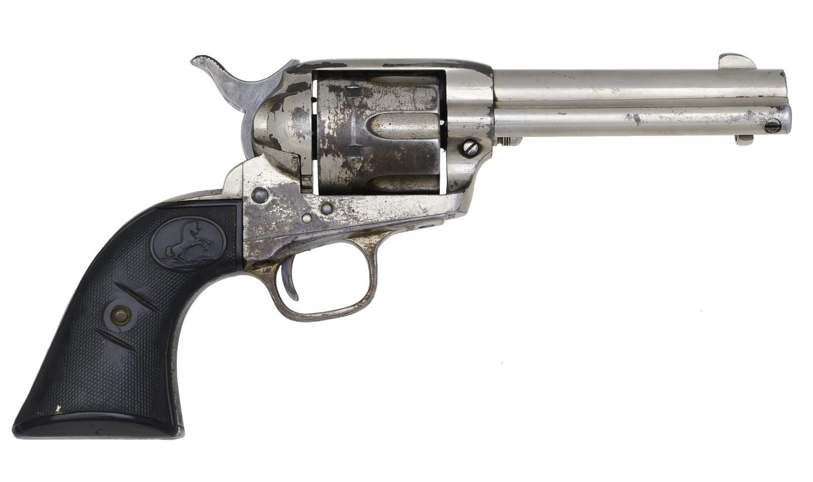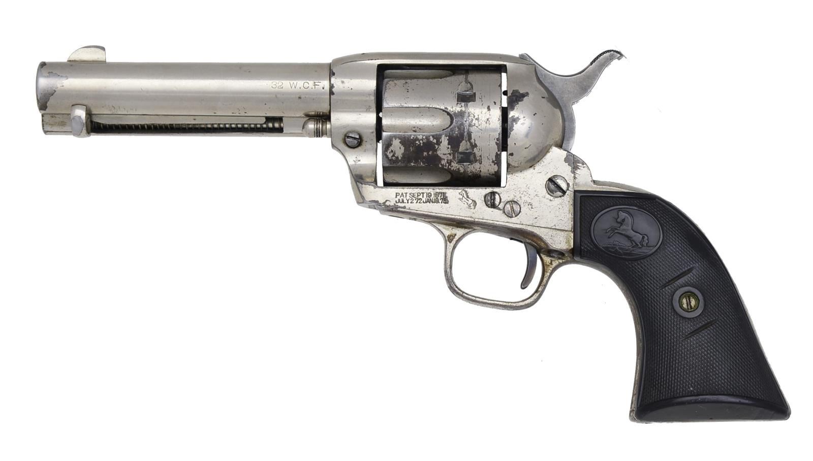Cal. 32 WCF. S# 336754. Bbl. 4 5/8". 6 Shot fluted cyl. nickel finished w/ case colored hammer & trigger. 2 Piece checkered hard rubber rampant Colt grips. Both grip panels have grooves cut above & below attachment screw. 1917 Mfg. CONDITION: 60% nickel finish blending w/ areas of patina most prevalent on trigger guard, cyl. & lower portions of frame. Grips show heavy wear. Bore retains sound rifling w/ scattered light pitting. PROVENANCE: Collection of Alan Bradley Shepherd. (20-4020/DS). CURIO. $1,500-2,500.