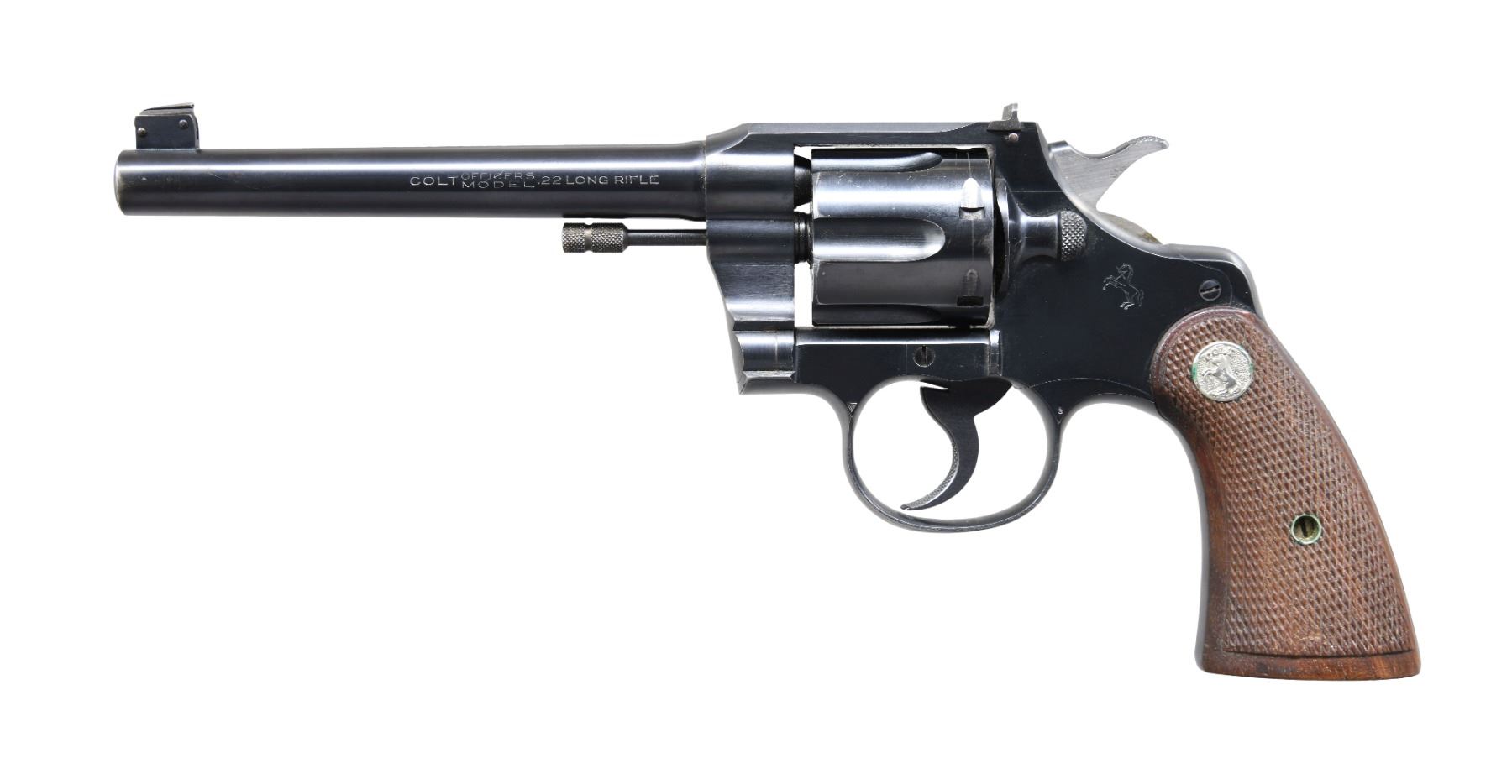 Cal. 22 LR. S# 4746. Bbl. 6" w/ adj. sights. Six shot round cyl. 2 piece checkered walnut grips w/ rampant colt medallions. Mfg. 1930. CONDITION: 90% blue showing light edge & muzzle wear. Grips show small handling marks. Very good bright bore. (24-5662/DS). CURIO. $800-1,200.