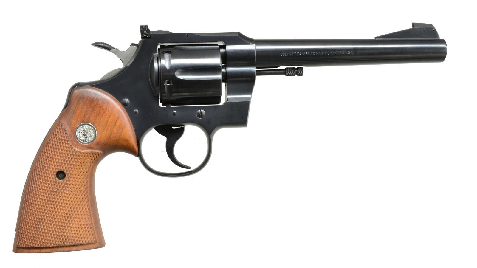 Cal. 22 Magnum. S# 79931. Bbl. 6" tapered rnd. w/ ramp mounted Patridge front sight & square notch adj. rear sight. 6 Shot fluted cyl. Blue finish. 2 Piece checkered walnut target grips w/ Rampant Colt medallions. Mfg. 1960 (1953-1969), approx. 850 produced in 22 Mag. UNATTACHED ACCESSORIES: 2 piece wood grain box w/ matching S# on bottom. Box contains numbered test target, handling the handgun brochure, circular wrench & brush. Box corners & edges are taped. CONDITION: over 98% original blue showing cyl. drag line. Grips have lightly worn finish. Bright near excellent bore. (20-4082/DS). CURIO. $3,000-4,000.