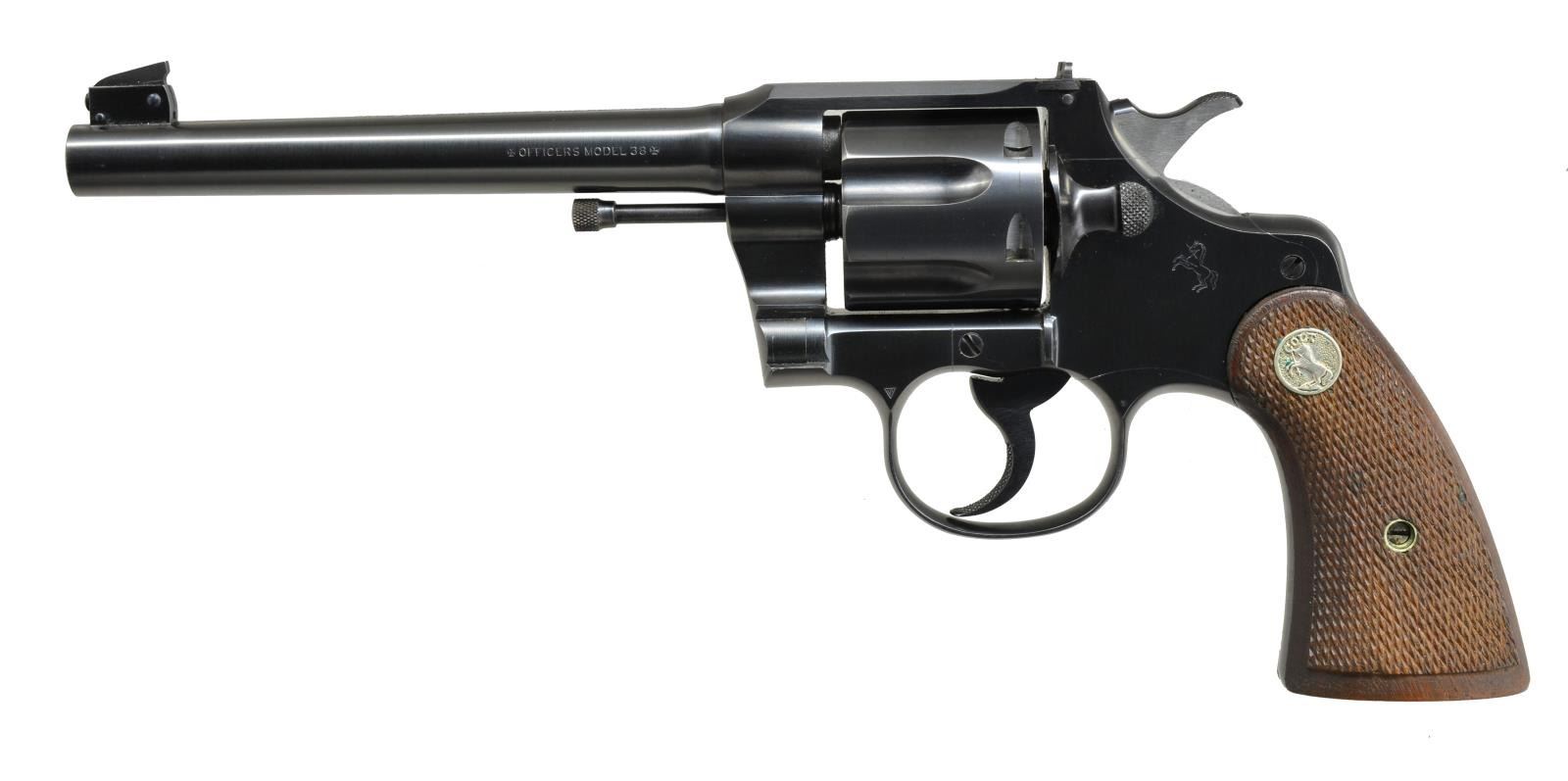 Cal. 38 Spl. S# 578606. Bbl. 6" w/ adj. blade front sight & square notch rear sight. 6 Shot fluted swing out cyl. Solid frame w/ matte finished flat top. Checkered trigger & hammer w/ polished sides. Checkered backstrap. Blue finish. 2 Piece checkered walnut grips w/ Rampant Colt medallions. Third Issue mfg. 1927. CONDITION: over 98% original blue. Grips show sm. handling marks. Bright near excellent bore. (21-1683/DS). CURIO. $600-900.