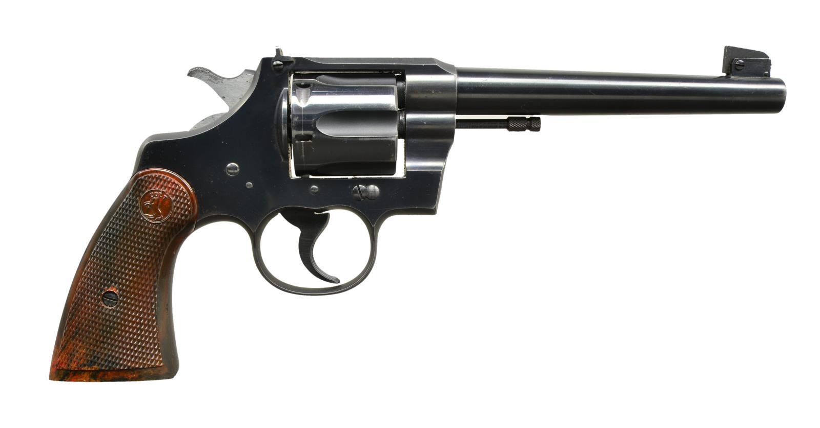 Cal. 38 Spl. S# 755188. Bbl. 6" with pinned adjustable front sight & adjustable rear sight. Flat top receiver. Serrated back strap. Fluted 6 shot cyl. Checkered Colt brown plastic grips. Serrated trigger. CONDITION: overall fine with some mild muzzle & edge wear. A few scattered handling marks. Cyl. shows fine drag line. Bright bore with sharp rifling. (22-4353/ZAL). MODERN. $700-1,100.