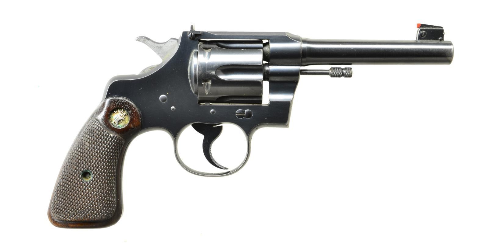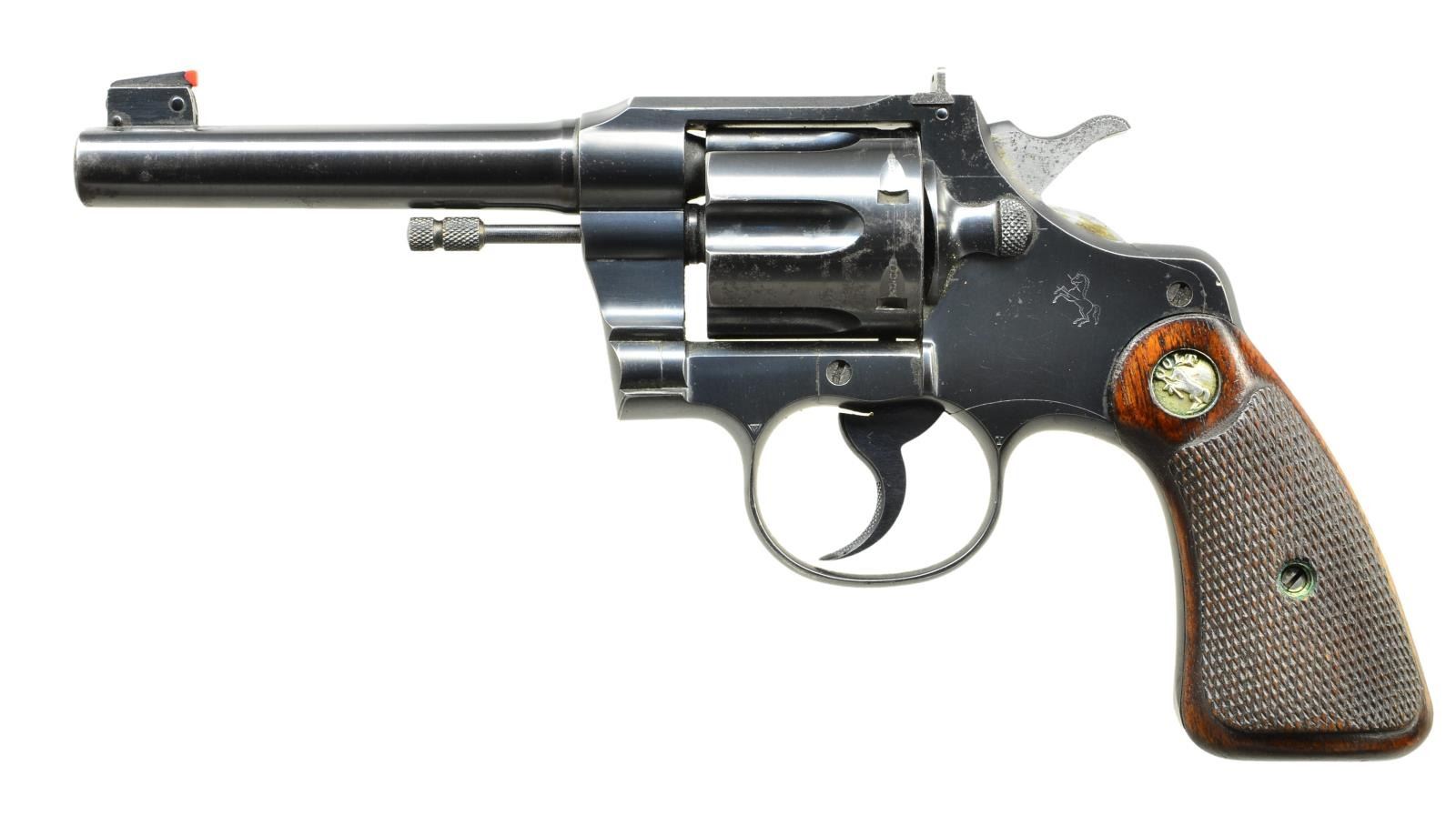 Cal. 22 LR. S #22000. Bbl. 4 1/2". Blade front sight w/ red paint. King adj. square notch rear sight w/ white outline. Bbl. is an unmarked replacement.. Checkered grips w/ silver Colt medallions. Left grip panel numbered "495979" on inside. UNATTACHED ACCESSORIES: factory letter stating the following information: Caliber: .22/c/ Barrel length: 6"/ Finish: Blue/ Type of Stocks: Not Listed/ Factory Engraved: Furnished with a 1/8" front sight and 2 3/4 lb. trigger pull./ Shipped To: W.A. Schutte Colwell Press Company Minneapolis Minnesota/ Date of Shipment: May 12, 1939/Colt Factory Order: #8445/ Guns in Shipment: 1. CONDITION: grips show moderate handling wear. Metal retains 85% original blue w/ some light pitting on cyl. scattered light oxidation & handling wear. Very good plus bore. (22-3114/MJC). MODERN. $400-600.