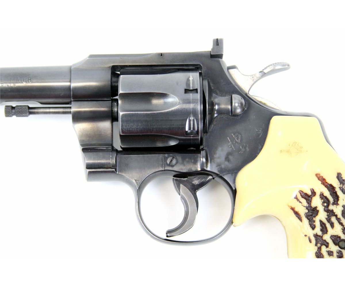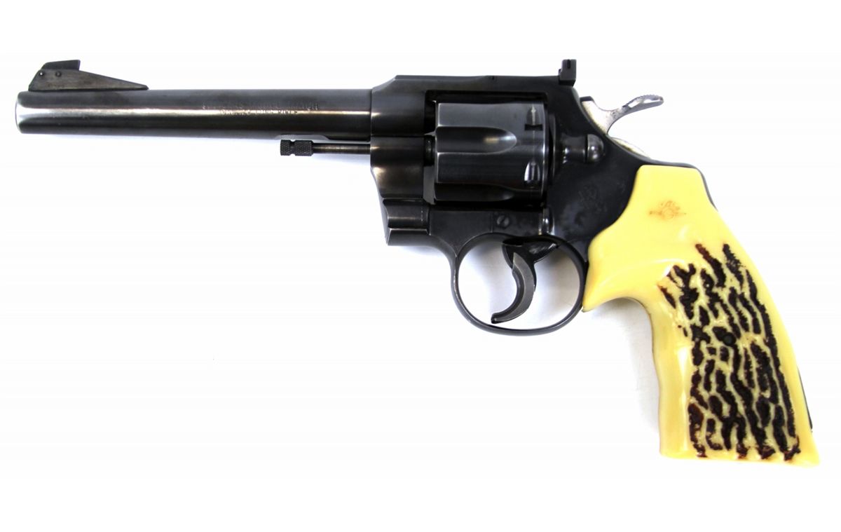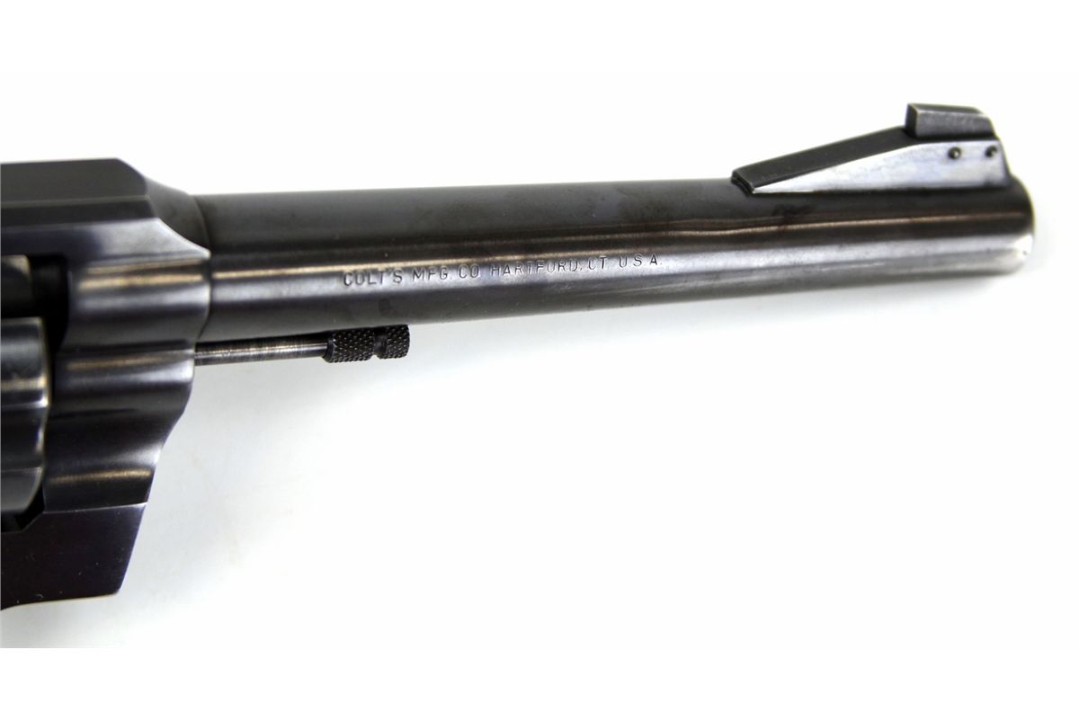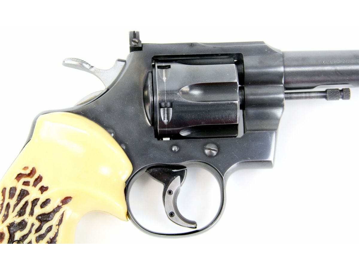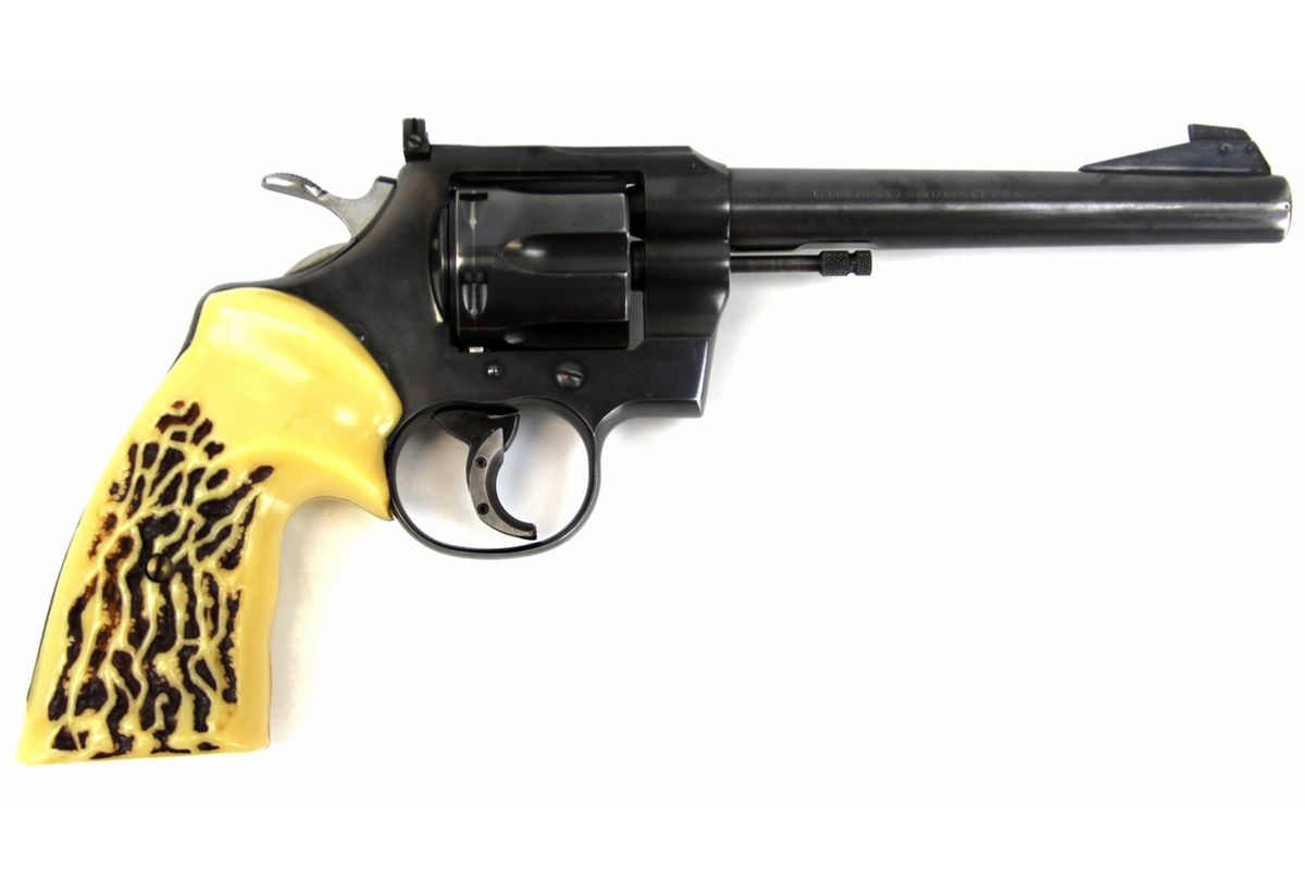 COLT OFFICERS MODEL MATCH .22 LR REVOLVER 1950 Colt Officer's Model Match .22LR revolver, manufactured in 1950. 6 inch barrel with 6 shot fluted cylinder, and faux stag grips. Type: Revolver Manufacturer: Colt Model: Officers Model Match Caliber / Gauge: .22lr Barrel Length: 6 inch Serial Number: 70252 Condition: Bore is bright and lean, bluing about 90%, and grips excellent.