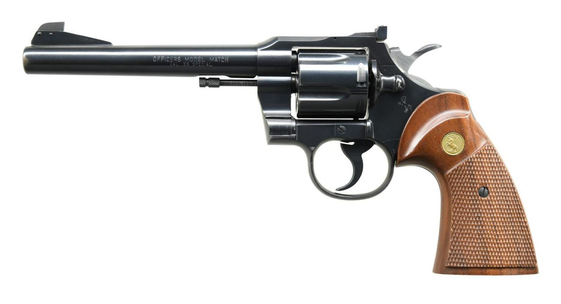 Cal. 38 Special. S# 934713. Bbl 6”. Colt Officers Model Match with a partridge front sight, fully adjustable rear sight, and semi-beavertail hammer. Left side of barrel marked with the model and caliber. Right side with Colt name and address in Hartford, CT. Rampant Colt on sideplate. Full target grips, each panel with a gold medallion over a generously checkered field. CONDITION: 95-97% with muzzle and sharp edge wear in expected places as would reflect light use. Comparable condition original grips. Mirror bore with sharp rifling. All cylinders index correctly. PROVENANCE: The Collection of Gun Sport Ltd owned by Jon R. Thomas. (23-4479/LA). CURIO. $750-950.