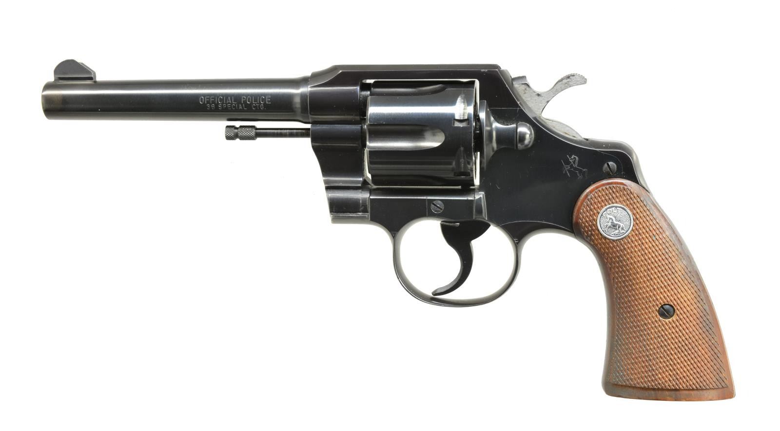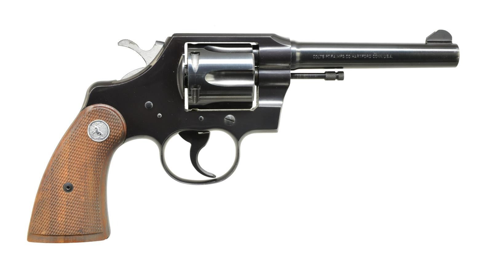 Cal. 38 Spl. S# 849511. Bbl. 5" w/ serrated ramp front sight having added white paint. 6 Shot fluted cyl. Blue finish. 2 Piece checkered walnut grips w/ Rampant Colt medallions. 1956 Mfg. CONDITION: over 97% original blue. Very good grips. Very good bright bore. (20-3781/DS). CURIO. $500-800.