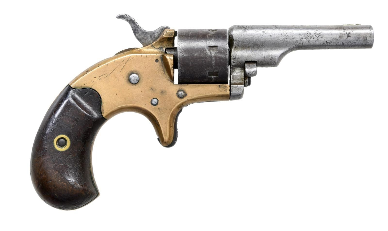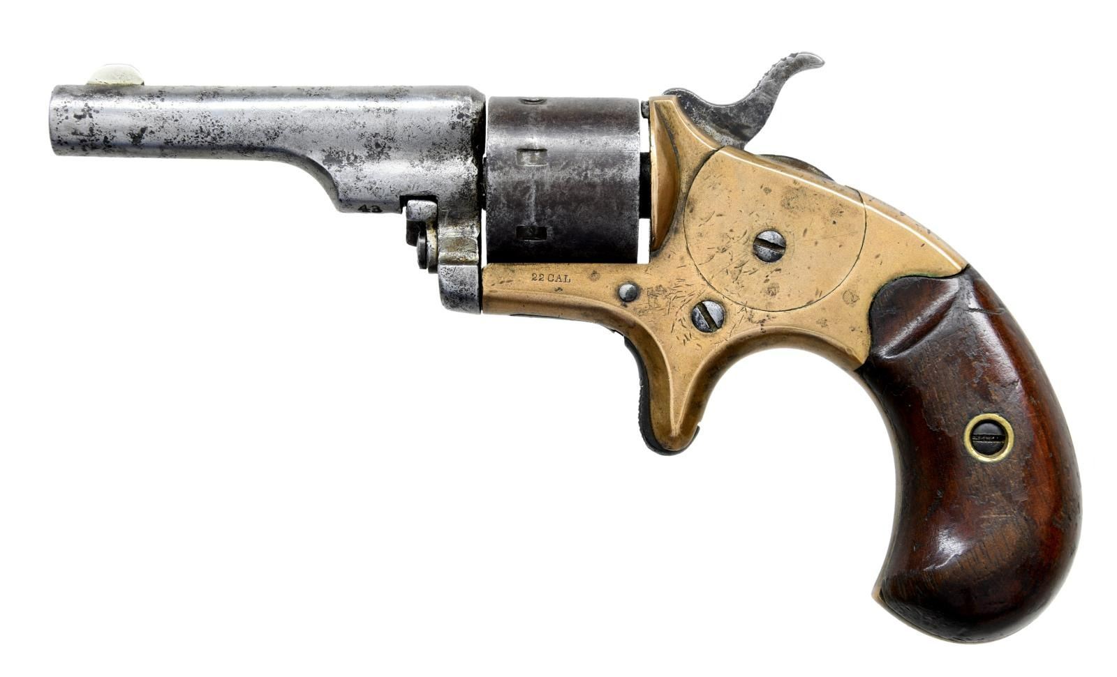Cal. 22 Short. S# 43820. Bbl. 2 3/8". Bbl. has Hartford address. Matching numbers on grip frame & bbl. Fixed rear sight & semi circular blade front sight. Standard production model. High spur hammer. Seven shot cyl. Two piece birds eye walnut grips. CONDITION: grips show overall flaking varnish, scattered dings & handling wear. Bbl. is a silver pewter w/ scattered pitting. Cyl. & hammer are a dull gray patina w/ scattered pitting. Frame is a dull yellow patina w/ scattered dings. Pitted & oxidized bore. (01-23595/MJC). ANTIQUE. $300-500.