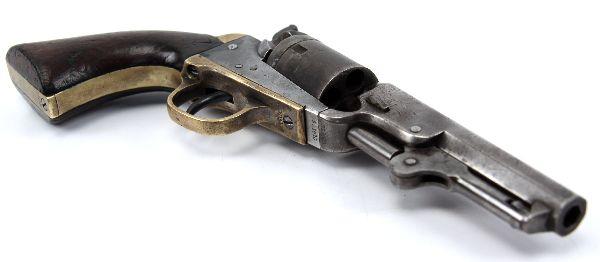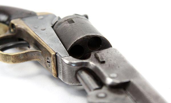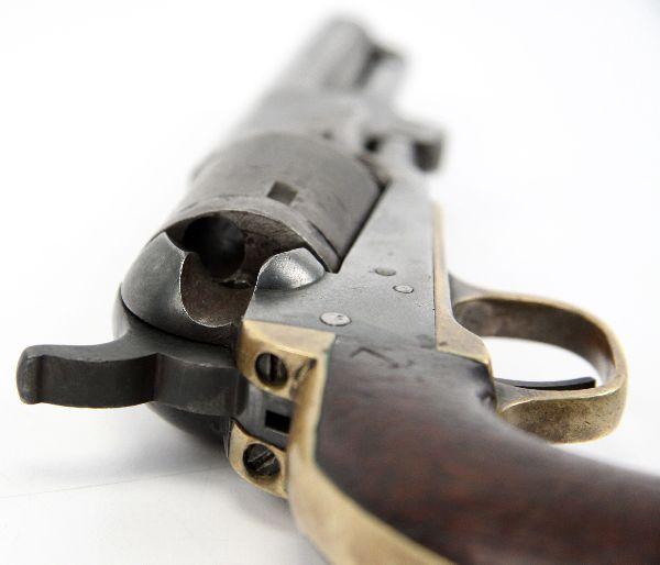 Colt Pocket .31 caliber revolver, with Thuer style conversion for front loading metal cartridges. Thuer conversions were limited between 1869, and 1872, due to the overall unsuccessful nature of the concept, and the introduction of the Single Action Frontier Model in 1873. Serial number indicates manufacture in 1870. All serial numbers are matching. Conversion appears period, though has no Thuer or Colt patent markings, and may have been done by a private gunsmith. Conversion ring on cylinder, as well as notch for front loading, show age, marks, and patina consistent with the rest of the gun. Top of barrel has the standard one line New York address. The left side of the frame is stamped "COLTS / PATENT" and "31 CAL" on the left trigger guard shoulder. Original bluing mostly placed by a mellow grey patina. Traces of original silver finish remain on the brass trigger guard. Gun as handling marks, with some early impact markings from tapping on the wedge pin, and one loose left screw. The grips are in very good condition, with a good patina over handling wear, and a minor chip to top left near shoulder of trigger guard. Cylinder is firm, and hammer pull is smooth. All appears in good mechanical condition. Overall very good condition for the age. SN: 321510 Caliber: .31