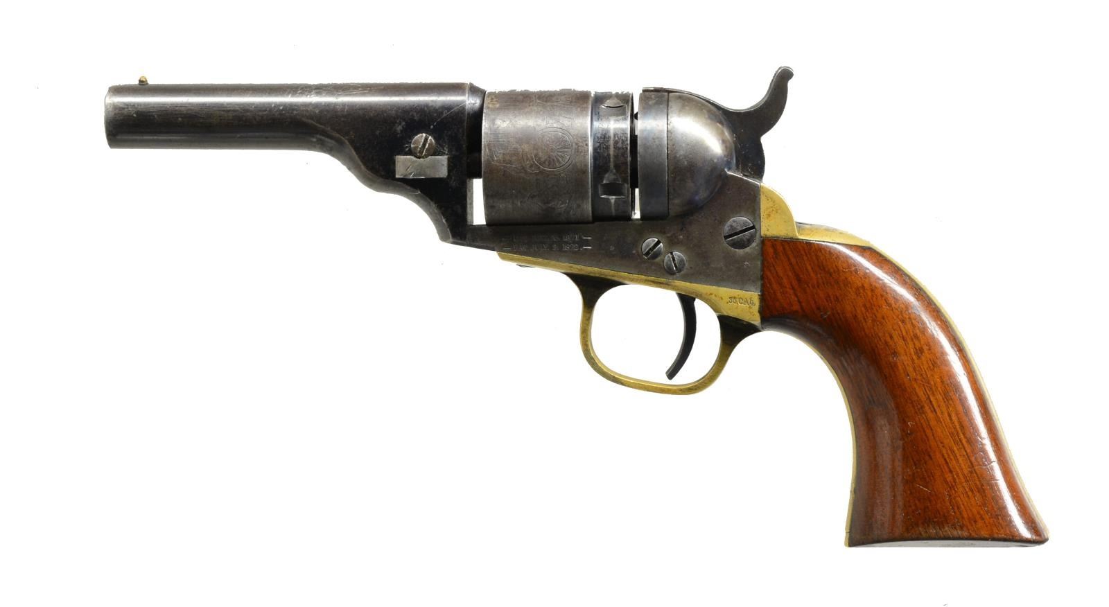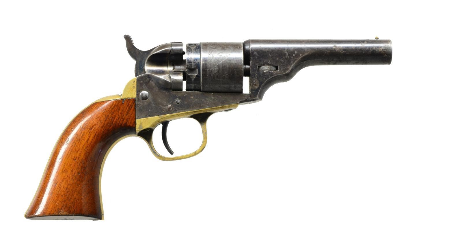 Cal. 38 CF. S# 323440. Bbl. 3 1/2" rnd. of solid type w/out ejector. 5 Shot rebated cartridge conversion cyl. w/ stage coach scene roll engraving. Blue finish w/ case colored frame & brass grip straps. 1 Piece walnut grip. Left side of frame is stamped w/ 1871 & 1872 patent dates. CONDITION: bbl. retains 70% lightly faded blue showing spots of corrosion w/ sm. dents in wedge area. Cyl. retains 40% dull fading blue retaining clear intact cyl. scene. Frame & hammer show 70% lightly faded case colors showing spots of corrosion. Grip straps show traces of silver finish. Grips show moderate wear & handling marks. Sound mechanics. Bore retains sound rifling. PROVENANCE: Collection of Alan Bradley Shepherd. (01-18644/DS). ANTIQUE. $800-1,200.