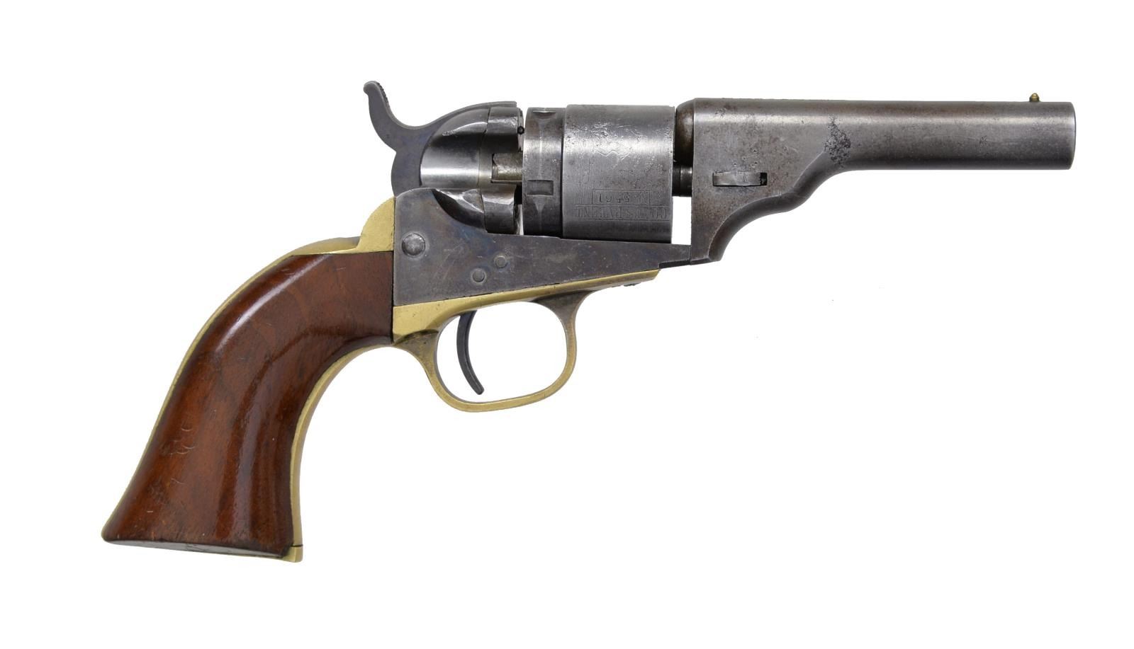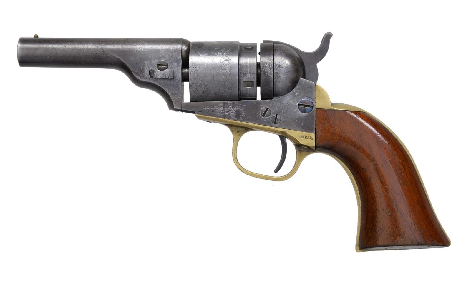 Cal. 38 CF. S# 315561. Bbl. 3 1/2" rnd. of solid type w/out ejector. 5 Shot rebated cartridge conversion cyl. w/ stage coach scene roll engraving. Blue finish w/ case colored frame & brass grip straps. 1 Piece walnut grip. Left side of frame is stamped w/ 1871 & 1872 patent dates. CONDITION: bbl. & cyl. finish is fading to mottled gray brown showing scattered spots of light pitting Frame has lightly faded case colors on right side, left side shows more fading w/ spots of pitting in patent date area. Grip straps show light cleaning w/ traces of plated finish. Grips show wear & handling marks. Sound mechanics. Bore is bright w/ strong rifling. PROVENANCE: Collection of Alan Bradley Shepherd. (01-18643/DS). ANTIQUE. $700-1,000.