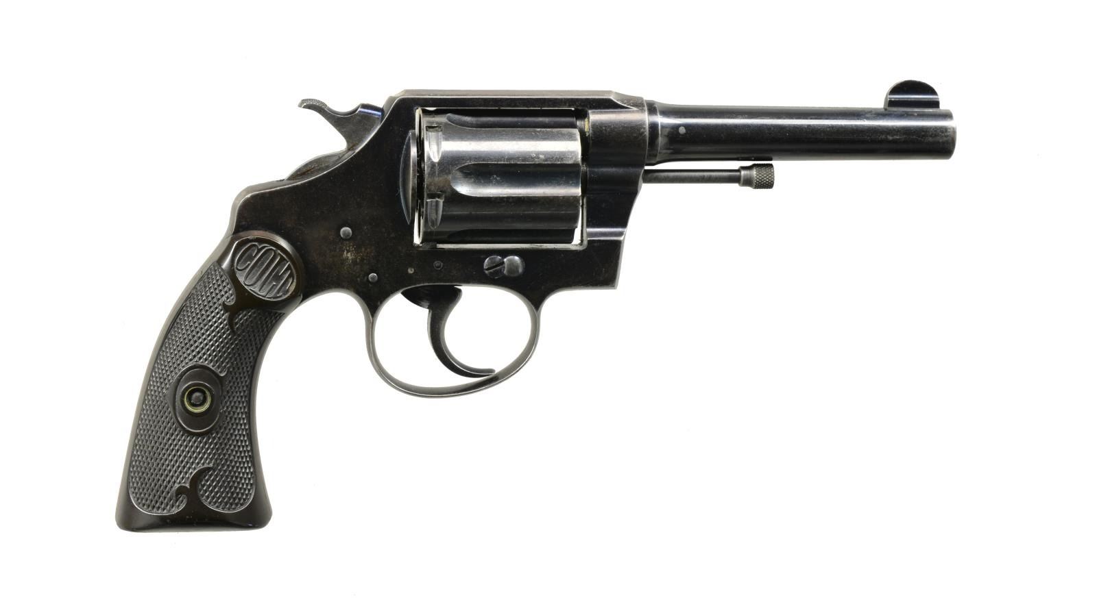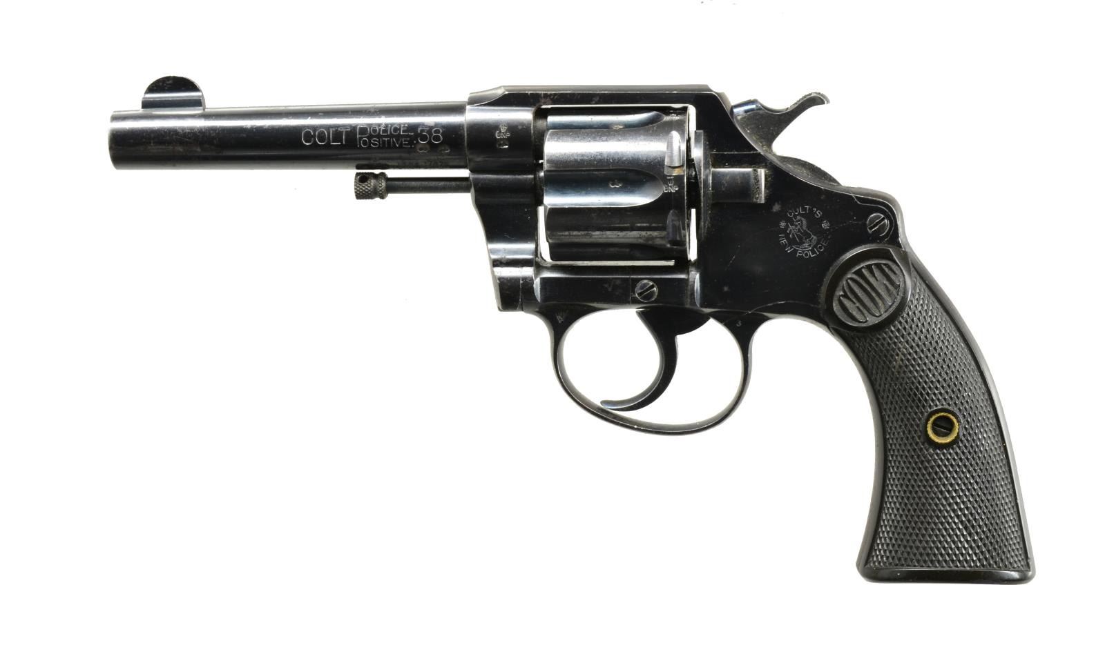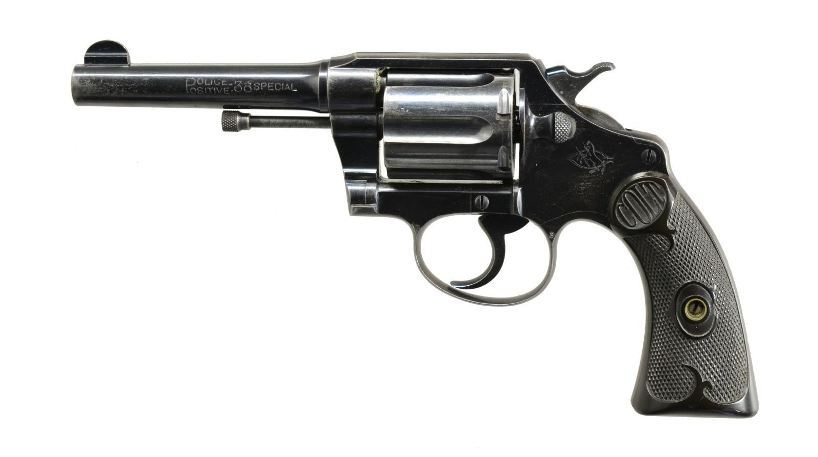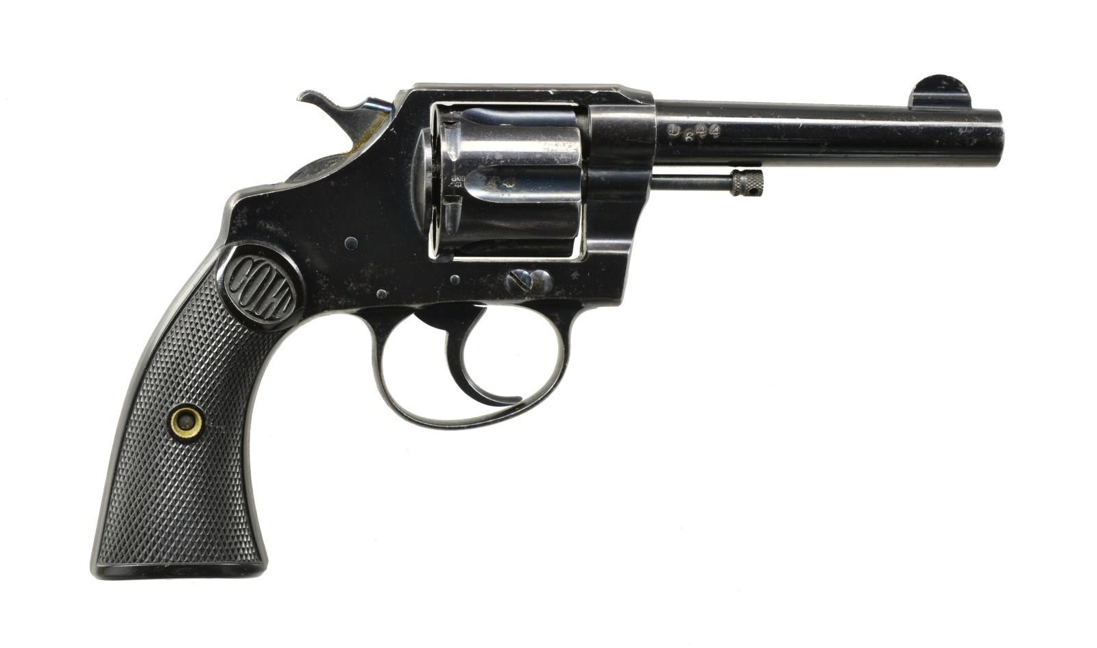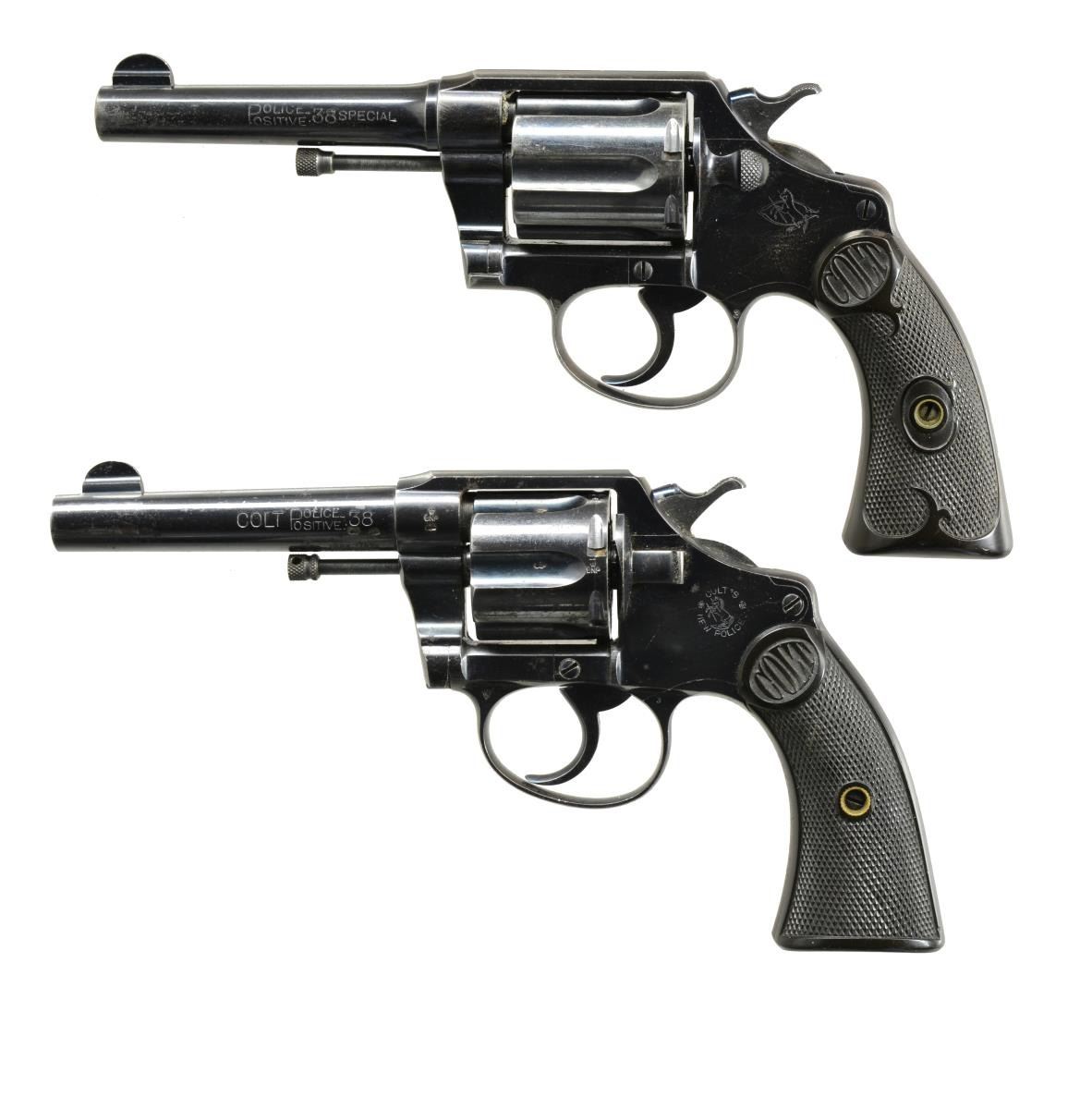 POSITIVE DA REVOLVERS. ALL: bbls. 4" w/ semicircular front sights. 6 Shot fluted cyls. Blue finish. 2 Piece checkered hard rubber Rampant Colt grips. 1) FIRST ISSUE. Cal. 38 Spl. S# 16675. Mfg. 1909 CONDITION: 70% lightly faded blue showing edge & muzzle wear. Grips show moderate wear. Sound mechanics. Bright bore retains strong rifling. (20-2337/DS). 2) ADAMS EXPRESS MARKED FIRST ISSUE. Cal. 38 New Police. S# 8559. Bottom of bbl. & left side of frame have British proof marks. Right side of bbl. has hand stamped ID# "D644". Bottom of grip is lightly engraved "ADAMS / DENVER CO.". 1906 Mfg. CONDITION: 70% lightly worn blue showing scattered sm. spots of pitting & sm. dents. Grips show light wear. Sound mechanics. Bore is bright w/ strong rifling. PROVENANCE: The Estate of Richard Willman. (20-2344/DS). ALL CURIO. $900-1,500.