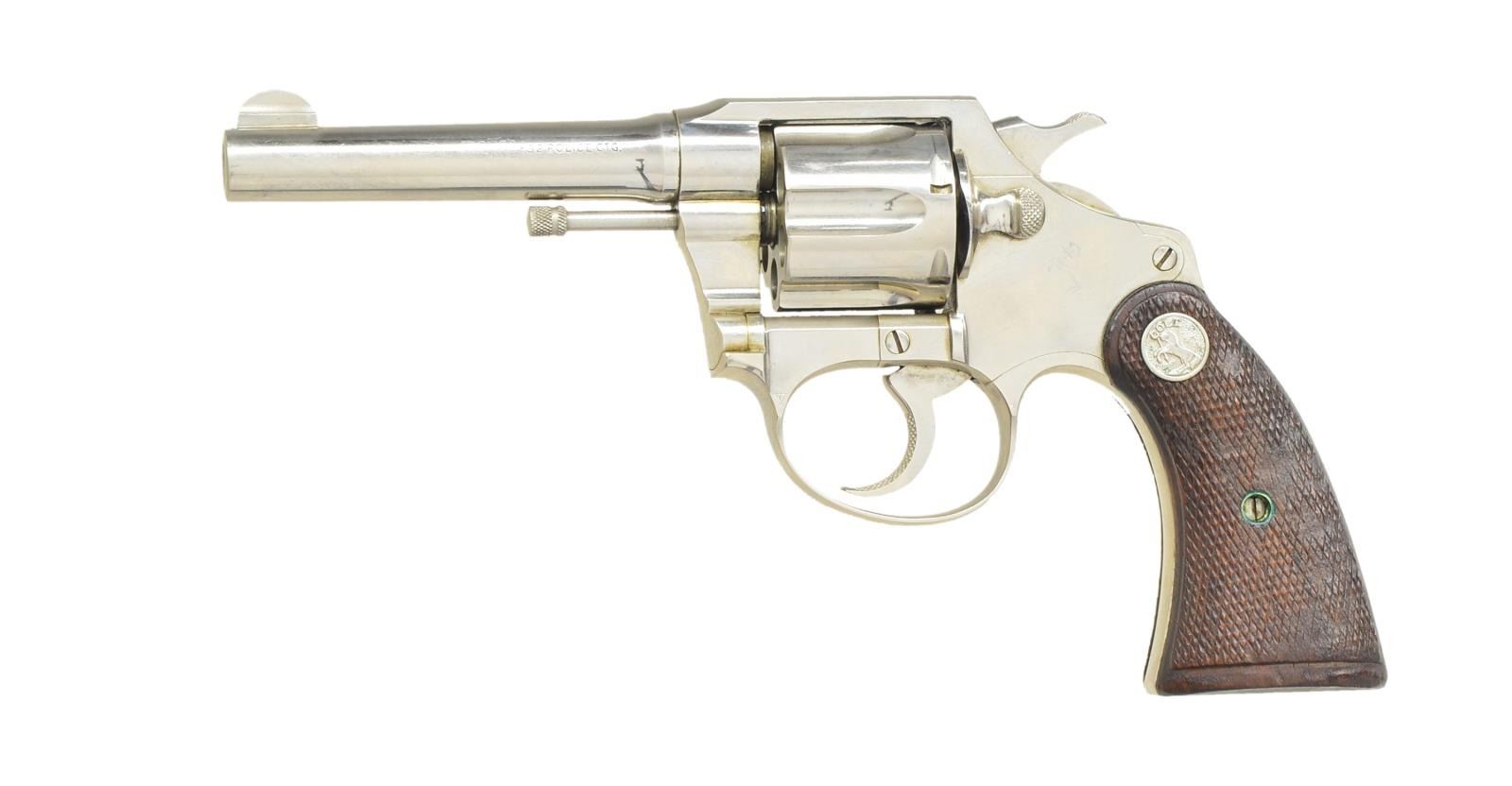 Cal. 32 Police (32 S&W Long). Ser. #337778 . Bbl. 4". 6 shot cyl. Fixed sights. SA/DA. Pistol marked on left sideplate w/ Rampant Colt. Bbl. is marked on left side "POLICE POSITIVE" "POINT 32 POLICE CTG". Bbl. is marked on top "COLT'S PT FA MFG CO HARTFORD CT U.S.A." & patent information. Checkered walnut grips w/ Colt logos. CONDITION: Revolver retains 90% original nickel plating w/ light wear & scattered handling marks. Well worn grips have extensive flattening of diamonds. Very good shiny bore. (22-4352/RW) CURIO. $300-500.