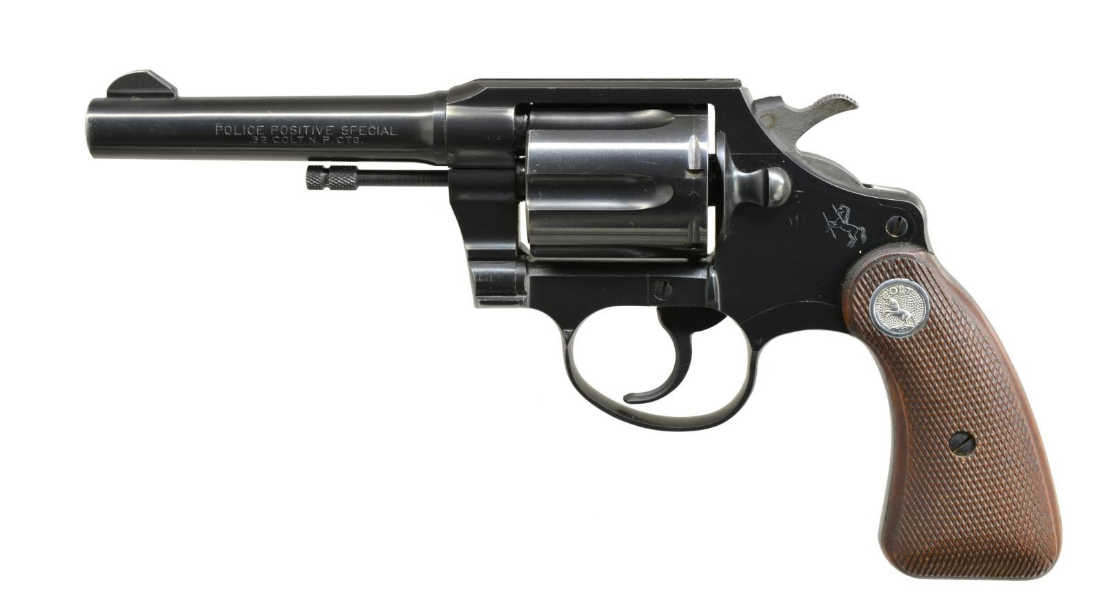 Cal. 32 Colt New Police. S# 745239. Bbl. 4" w/ serrated ramp front sight. 6 Shot fluted cyl. Blue finish w/ Rampant Colt on side plate. 2 Piece checkered walnut grips w/ Rampant Colt medallions. Third Issue revolver, mfg. 1959. CONDITION: over 90% blue showing edge wear & sm. scratches. Grips show moderate wear. Bright bore w/ strong rifling. (20-3313/DS). CURIO. $400-600.