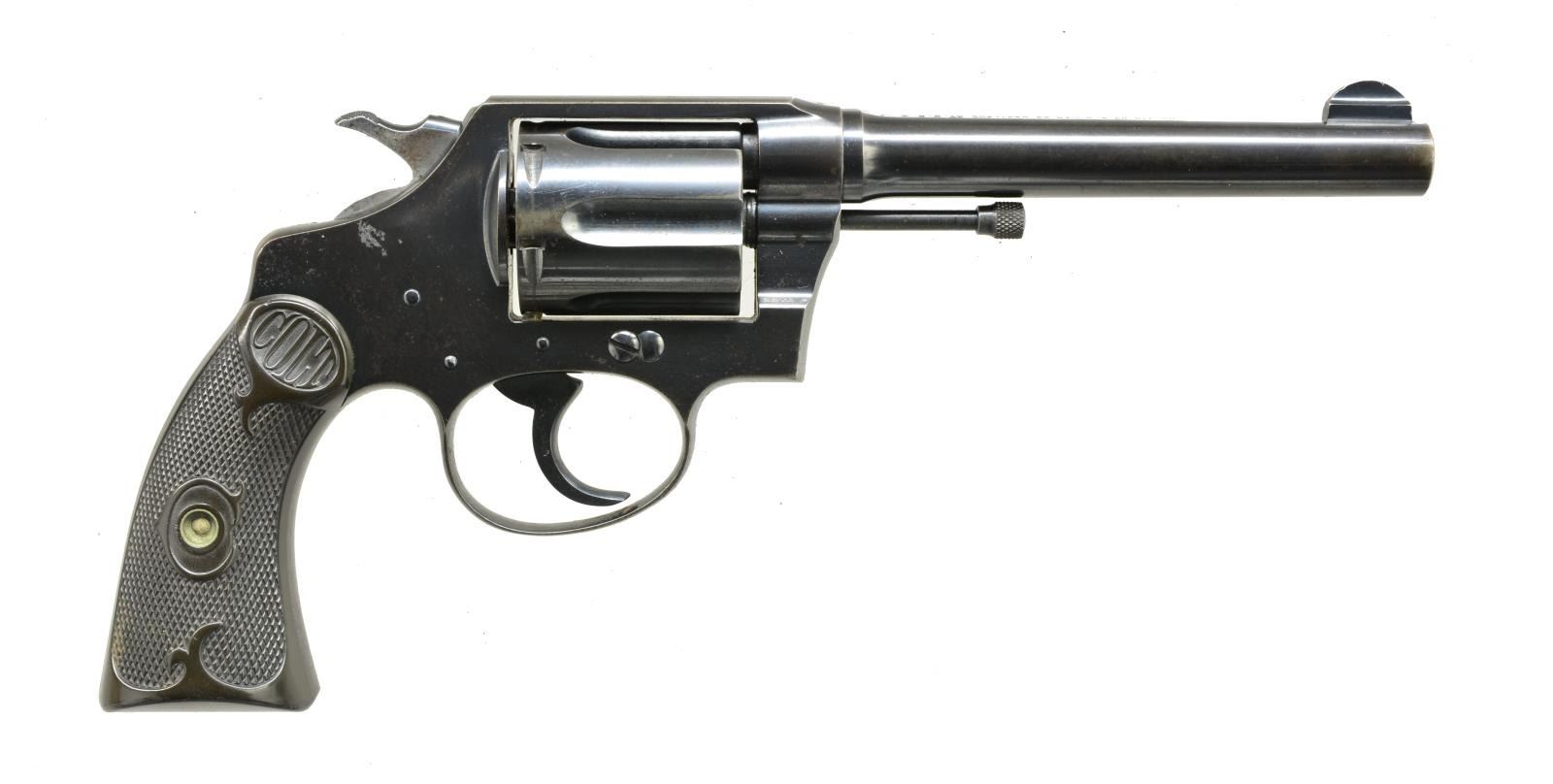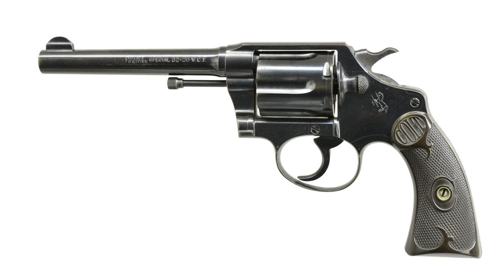 REVOLVER. Cal. 32-20 WCF. S# 279791. Bbl. 5" rnd. w/ integral semicircular sight. 6 Shot fluted cyl. Blue finish. 2 Piece checkered hard rubber grips. 1923 Mfg. CONDITION: over 85% blue showing scattered spots of freckling. Grips show light wear. Smooth mechanics. Bore retains strong rifling. (20-3778/DS). CURIO. $500-800.