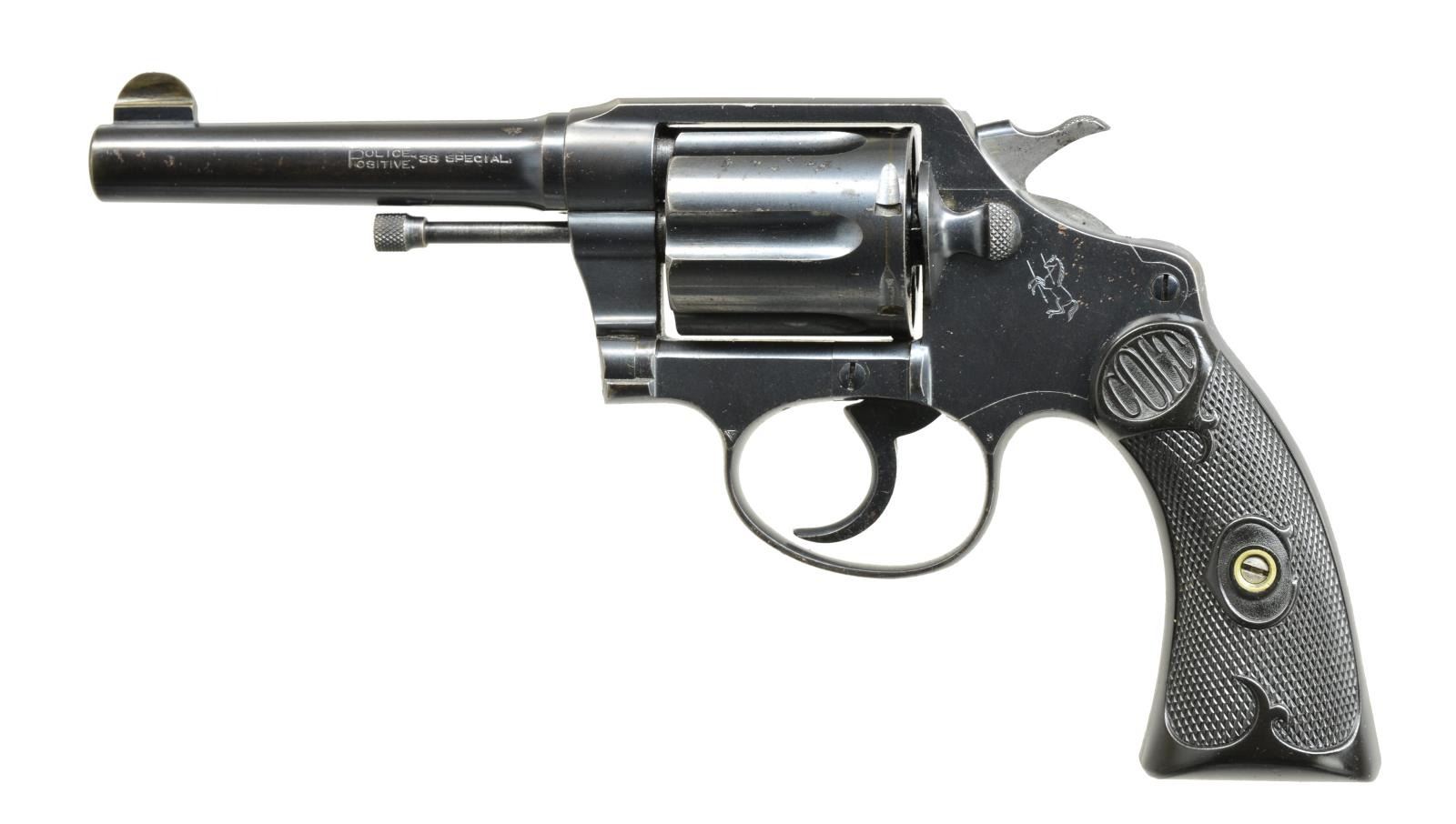 REVOLVERS. ALL: bbls. 4". 6 Shot fluted cyls. 1) POLICE POSTIVE SPECIAL FIRST ISSUE. Cal. 38 Spl. S# 211425. Replacement semicircular blade front sight. Blue finish. 2 Piece checkered hard rubber grips. 1920 Mfg. CONDITION: over 80% lightly faded blue showing spots of freckling. Grips show light wear. Bore retains sound rifling showing scattered spots of light pitting. (20-3715/DS). 2) CUSTOM ENGRAVED NEW POLICE. Cal. 32 Colt New Police. S# 44730. Semicircular front sight. Action & bbl. including back strap & trigger guard have 75% coverage over finely executed vine type foliate scroll engraving w/ punch dot backgrounds. Custom matte gray finish w/ blued cyl. release & ejector knob. Hammer & trigger retains fire blue finish. 2 Piece checkered hard rubber grips. 1907 Mfg. CONDITION: satin finish shows light wear. Trigger & hammer retains 70% finish. Grips show light wear. Lightly pitted bore w/ intact rifling. (20-3775/DS). ALL CURIO. $750-1,250.