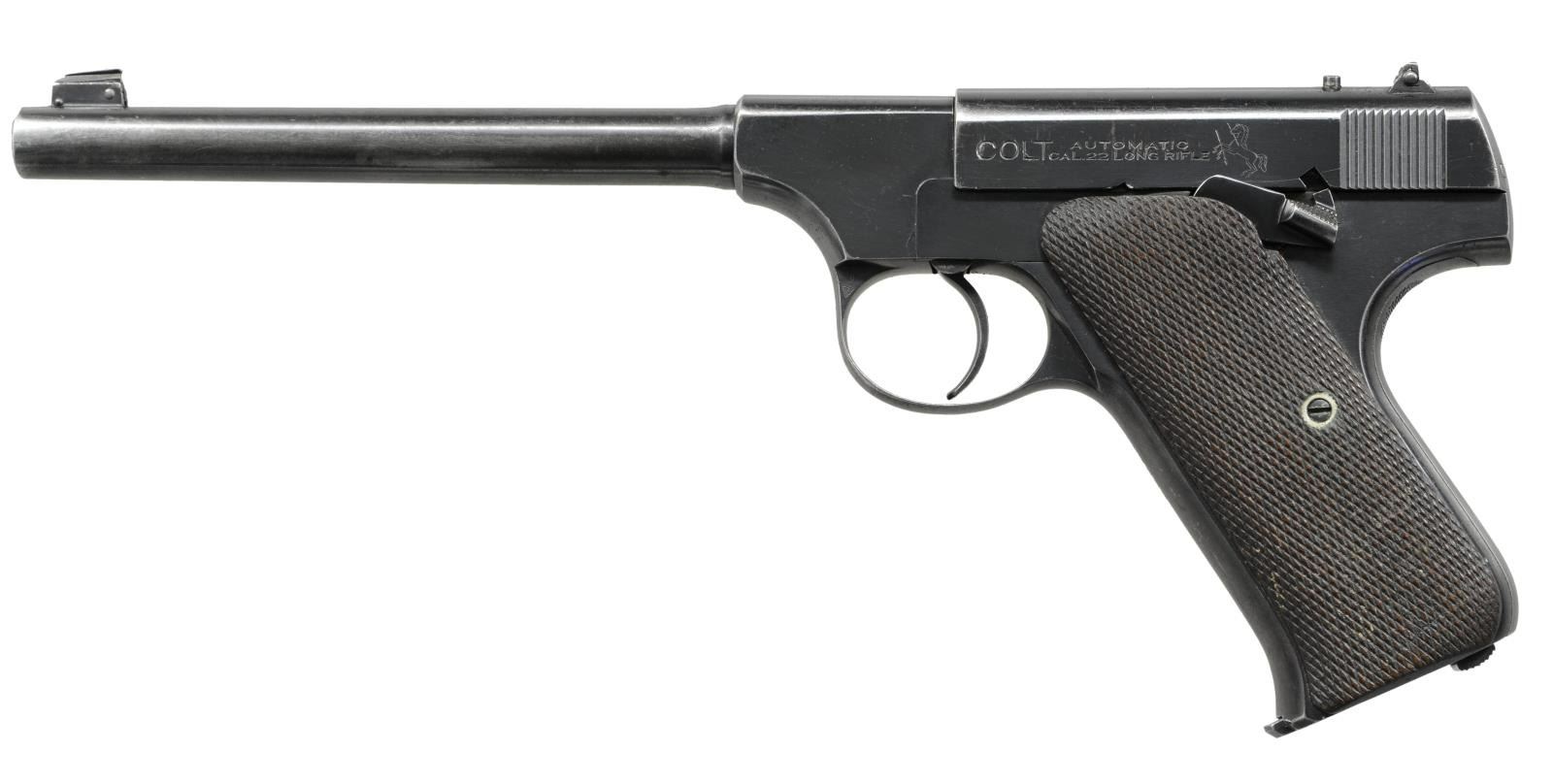 Cal. 22 LR. S# 45205. Bbl. 6 5/8" with elevation adjustable bead sight; windage adjustable rear on slide. Mfg. 1926 (1915-1927; approx. 54,000 units) with checkered walnut grips. Checkered oval on backstrap; suitable ONLY for standard velocity ammo. Bottom mag. latch. Smooth faced trigger. MAGS: factory 10 rd. all blued (not in the white at top) with metal follower and proper 2 line marking on base. CONDITION: good plus overall with light marks and thinning finish throughout. Peppery oxidation in grip area. Good left grip with hand wear; similar right with addition of chip at bottom front. Near excellent bore. (23-1494/NW). CURIO. $350-500.