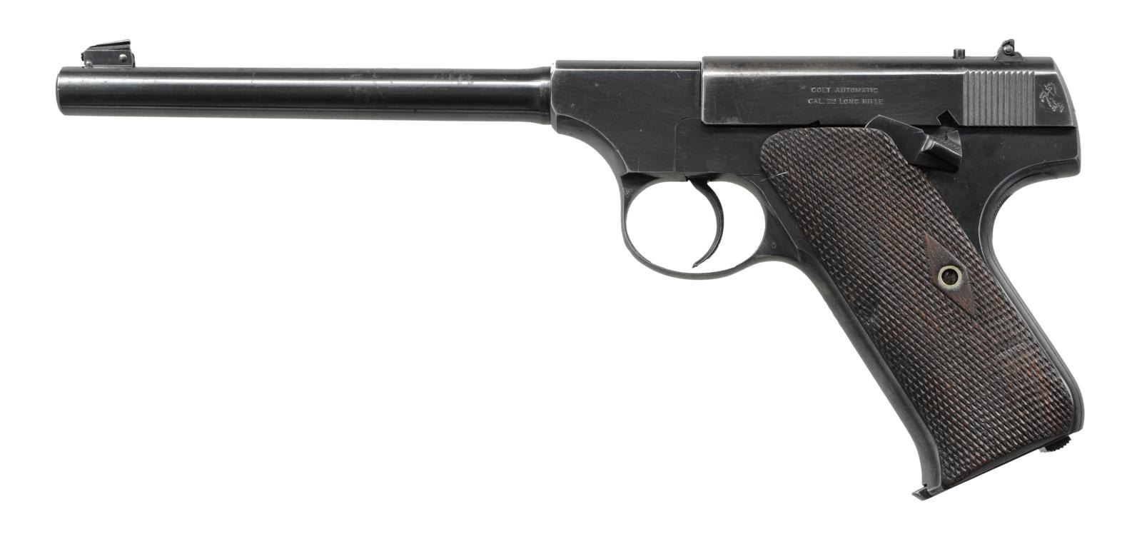 Cal. .22 LR. S# 9116. Bbl 6 5/8". Pre-Woodsman manufactured in 1919. Barrel bears Colt's 2 line address over the top, with the left side of the slide bearing the caliber designation. Metal components are blued, with the grips consisting of checkered walnut. Blade front sight with adjustable U-notch rear sight. CONDITION: metal components retain the majority of their original factory blue finish, exhibiting areas of wear and thinning that show through to gray and brown patina, with some scattered superficial handling marks and a couple spots of light pitting. Mirror bore, exhibiting well defined rifling throughout. Grips exhibit smoothing and some scattered marks from handling and storage, but are otherwise good. (23-1757/MLW). CURIO. $500-800.