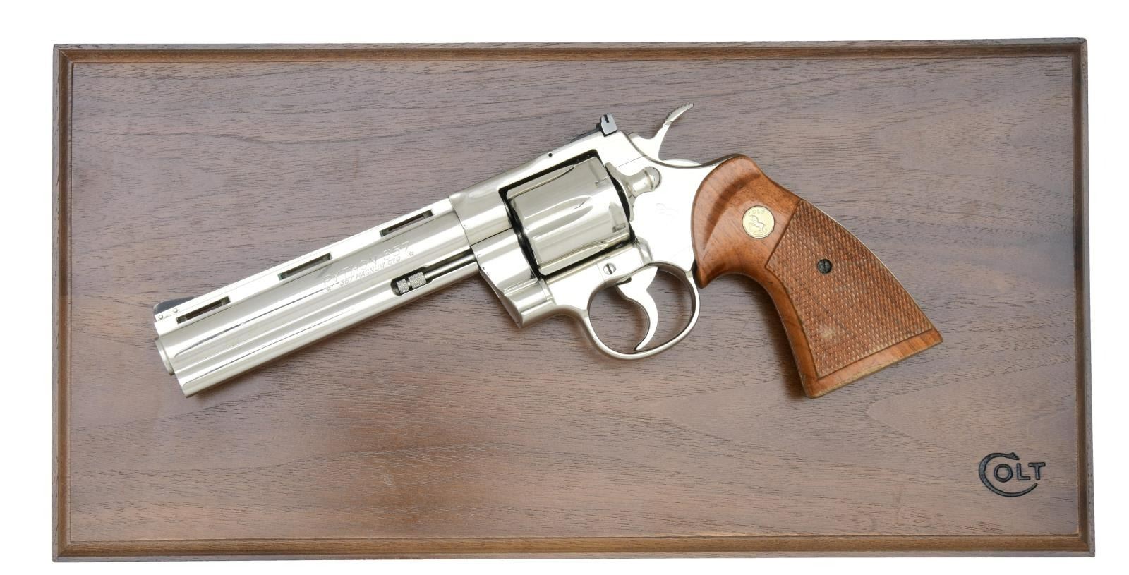 Cal. 357 Magnum. S# K85194. Bbl. 6" with vent rib and full ejector lug. Serrated ramp front sight with square notch adjustable rear sight. Six shot fluted cylinder. Full nickel finish. 2 Piece checkered walnut combat grips with rampant colt gold medallions. Manufactured: 1982. UNATTACHED ACCESSORIES: a Colt marked wood presentation box with blue velour fitted interior. Inside of lid has brass plate with rampant colt motif and Colt Python 357 markings. CONDITION: 98% nickel finish showing small handling marks. Blued sights show edge wear. Grips show finish wear with small dents and chips at butt. Bright near excellent bore. PROVENANCE: from The Collection of Gun Sport Ltd owned by Jon R. Thomas. (23-3951/DS). MODERN. $3,000-4,000.