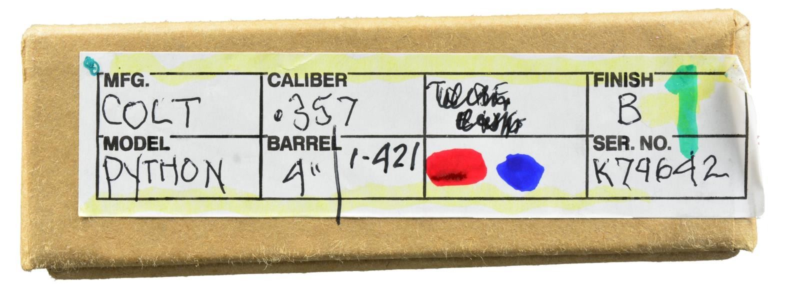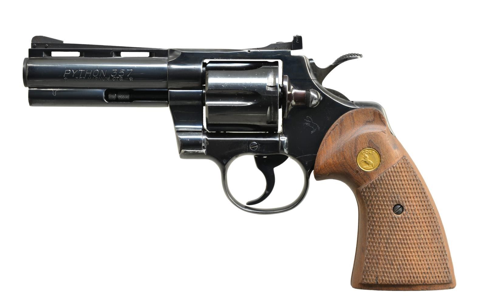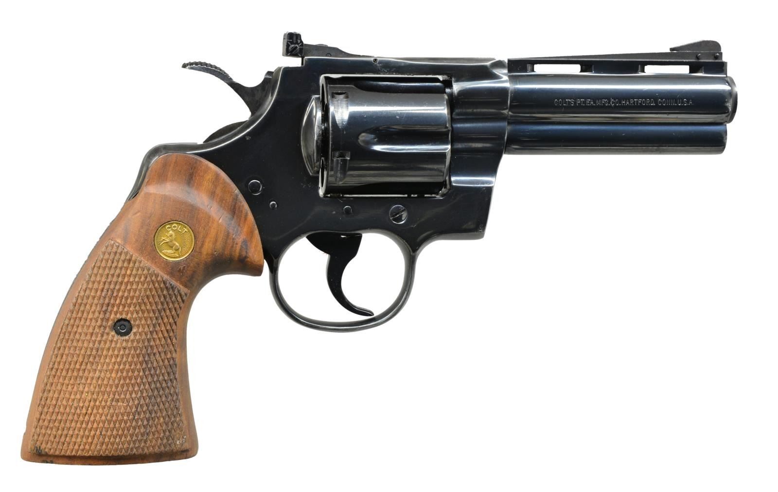 Cal. 357 Mag. S# K79642. Bbl. 4" w/ VR & full lug. Serrated ramp pinned blade front sight w/ adj. square notch rear sight. 6 Shot fluted cyl. Blue finish. 2 Piece checkered walnut target grips w/ gold Colt medallions. Mfg. 1982. UNATTACHED ACCESSORIES: Protecta-gun box. CONDITION: top strap of frame has altered contours. 90% Reblued metal finish. Grips have matte oil style refinish. Bright near excellent bore. (21-931/DS). MODERN. $1,200-1,800.