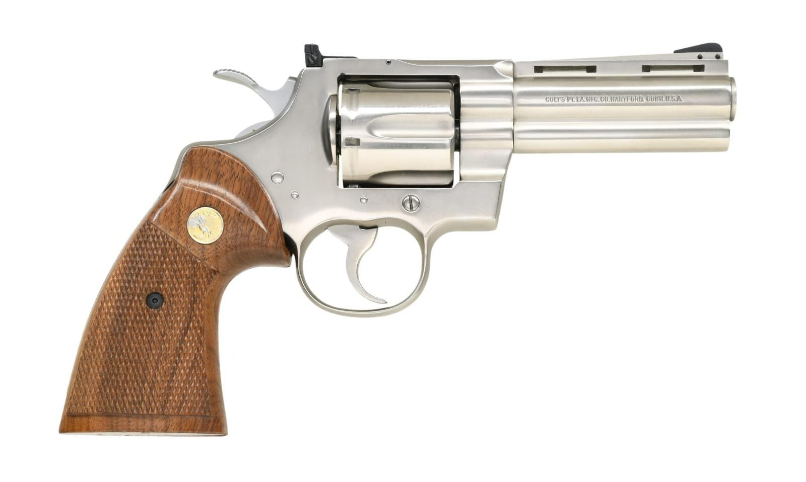 Cal. 357 Magnum. S# V78140. Bbl. 4" w/ vent rib & full length ejector shroud. Serrated ramp front sight w/ adj. square notch rear sight. Six shot fluted cyl. Electroless nickel finish. 2 Piece checkered walnut grips w/ rampant colt gold medallions. Mfg. 1979. CONDITION: nickel finish shows small wear marks & cyl. drag line. Grips have a series of small dents at butt. Very good bright bore. PROVENANCE: from The Collection of Gun Sport Ltd owned by Jon R. Thomas. (23-3935/DS). MODERN. $2,750-3,500.