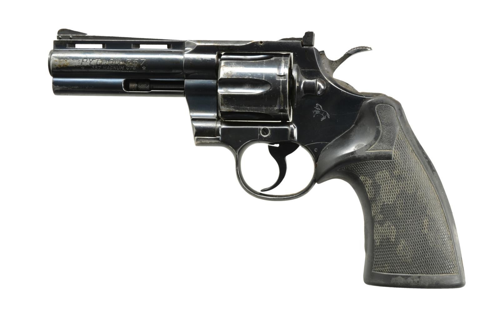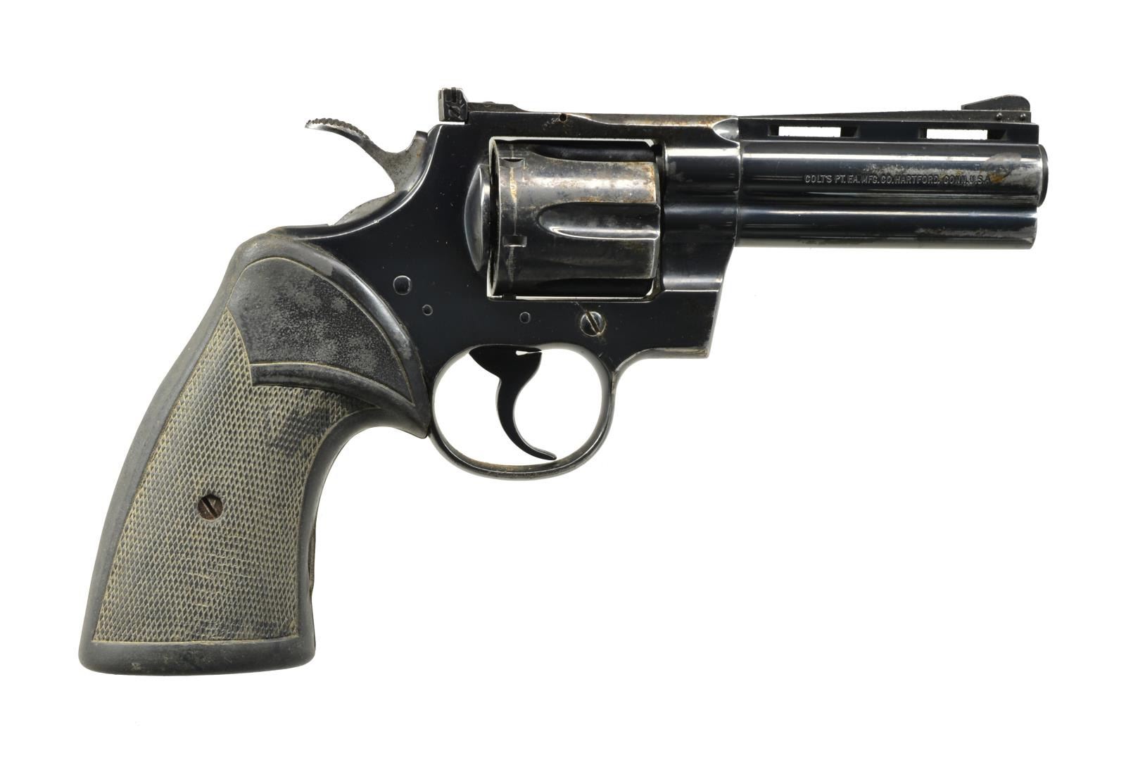 Cal. 357 Mag. S# V08999. Bbl. 4" VR full lug w/ serrated ramp front sight & Accro rear. Mfg. 1978 w/ blued finish. Pachmayr Signature grips. CONDITION: about good overall condition w/ significant holster wear & areas of light & peppery oxidation; mostly on cyl. Light scratches around replacement sideplate screw & slot damage to crane retention screw. Staining on sides of hammer. Very hand worn grips. Firing residue in chambers indicating mostly 38 Spl. use. Near excellent bore. Fine candidate for refurbishing or custom build. (20-2663/NW). MODERN. $800-1,200.