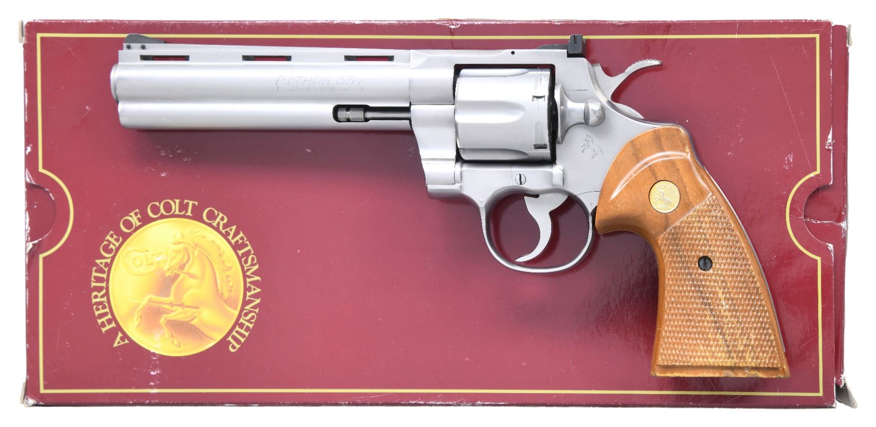 Cal. 357 Mag. S# T19885. Bbl is 6" with vent rib and full length ejector shroud. Pinned serrated ramp front sight with square notch adjustable rear sight. 6-shot fluted cyl. Stainless steel construction. 2pc checkered walnut target grips with gold rampant colt medallions. Manufacture date 1984. UNATTACHED ACCESSORIES: foam lined box with matching label. Box contains instruction manual and service agreement card. CONDITION: stainless finish shows small wear spots and handling marks with a cyl drag line. Grips show areas of peeling finish with small dents at butt. Sound action. Very good bright bore. (25-1468/DS). MODERN. $1,750-2,500.